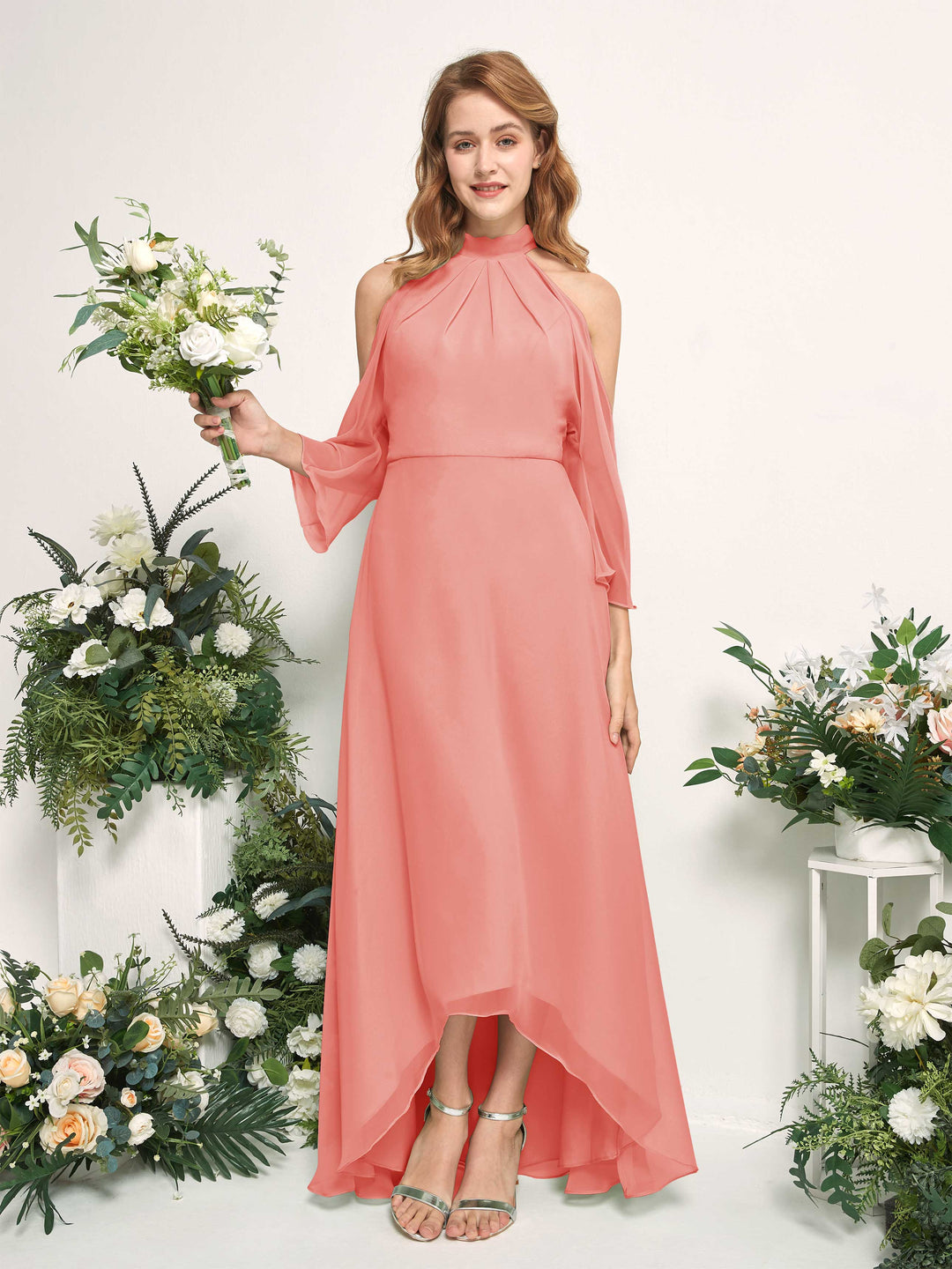 Peach Pink Chiffon A-Line Round Neck Maxi Dress