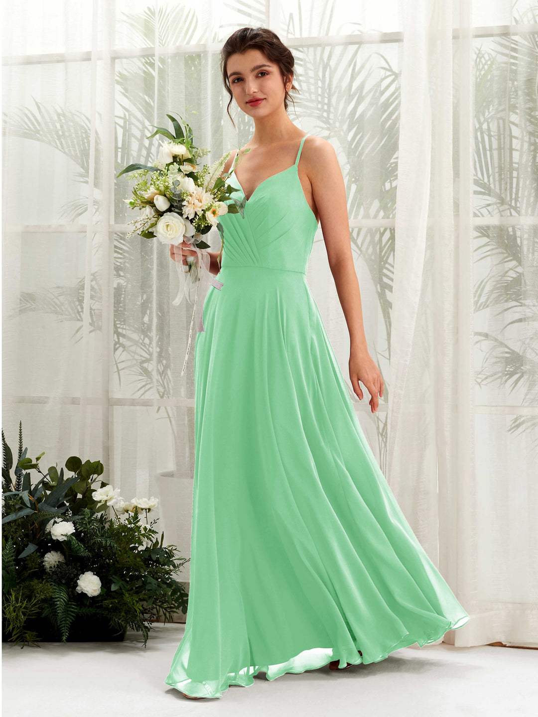 Mint Green Chiffon A-Line V-Neck Strappy Back Maxi Dress