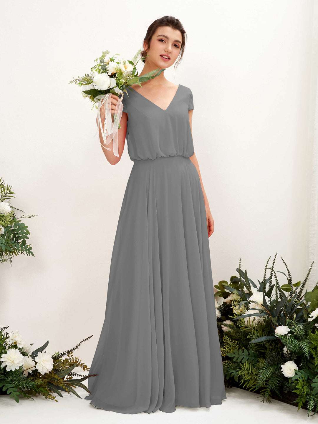 Steel Gray Chiffon A-Line V-Neck Maxi Dress