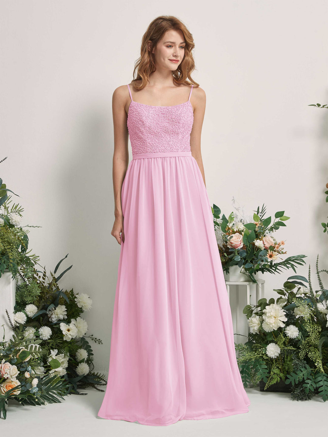 Candy Pink Chiffon A-Line Scoop Neck Strappy Back Maxi Dress