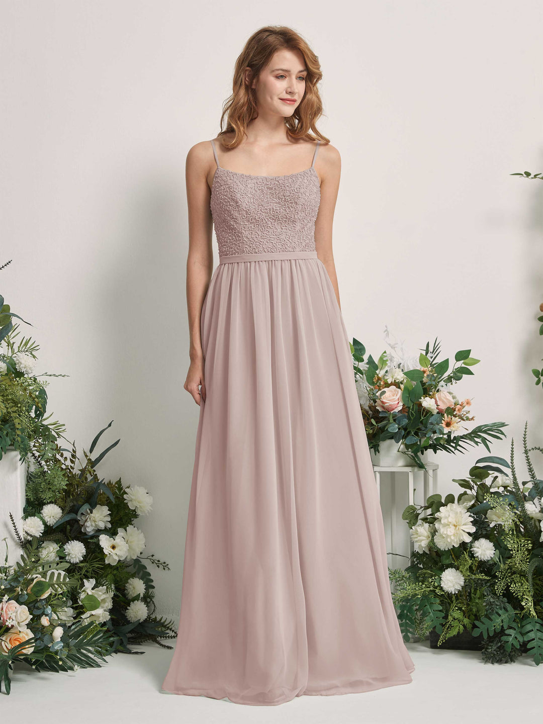 Taupe Chiffon A-Line Scoop Neck Strappy Back Maxi Dress