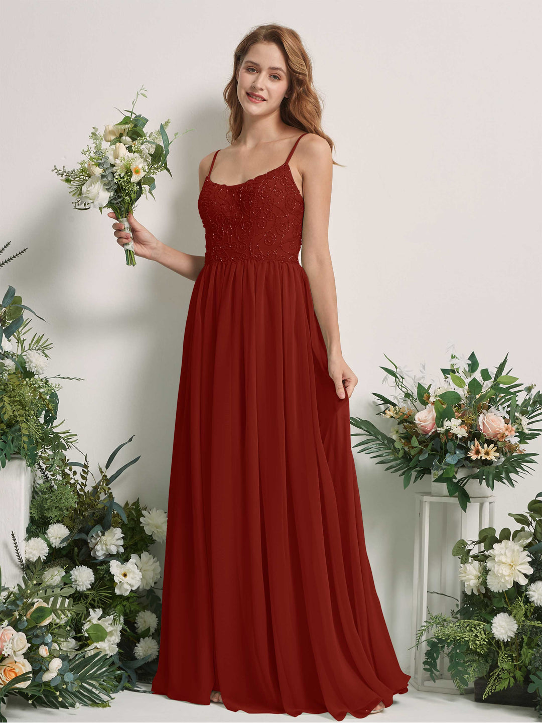 Rust Chiffon A-Line Scoop Neck Strappy Back Maxi Dress