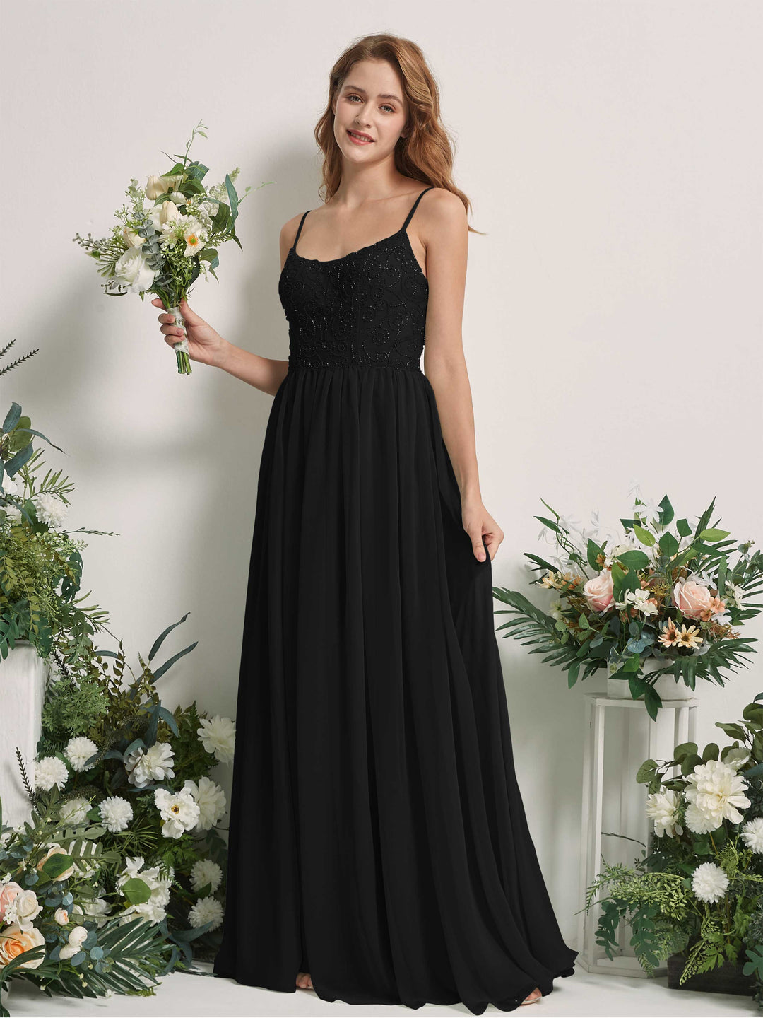 Black Chiffon A-Line Scoop Neck Strappy Back Maxi Dress
