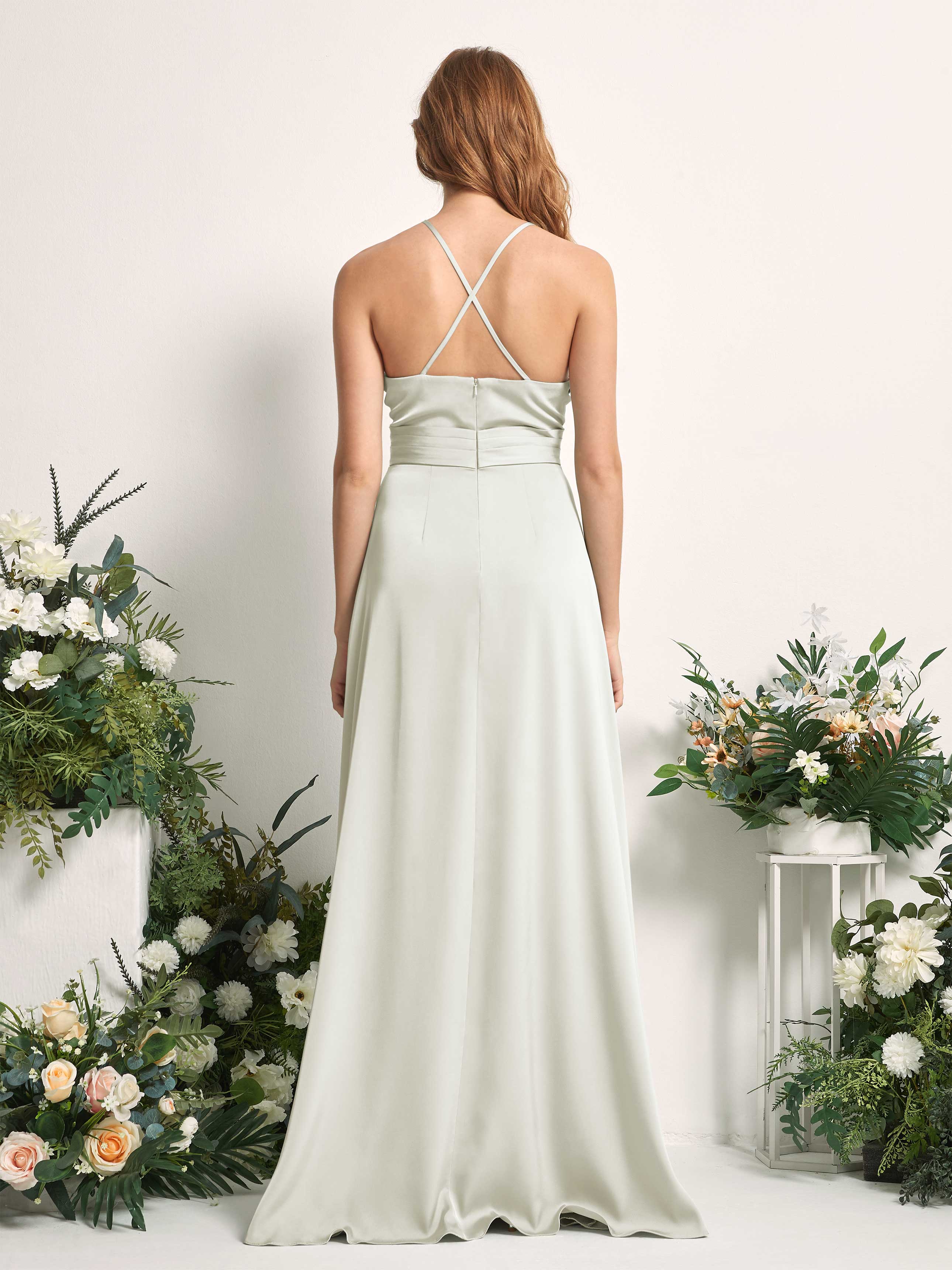 Carlyna Allison A-Line Sage Green Satin Bridesmaid Dress Maxi Sleeveless V-Neck Dress Back View