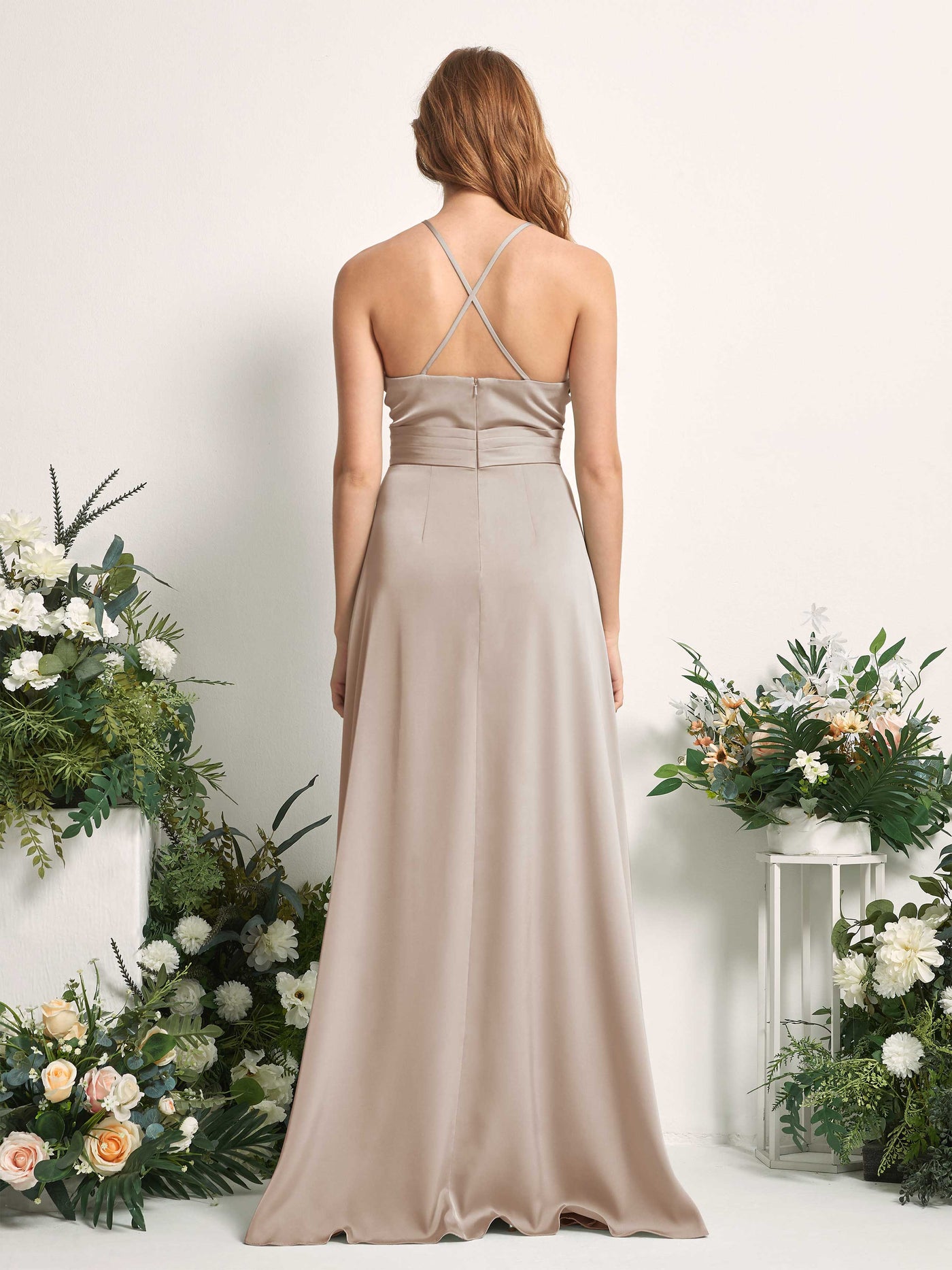 Carlyna Allison A-Line Taupe Satin Bridesmaid Dress Maxi Sleeveless V-Neck Dress Back View