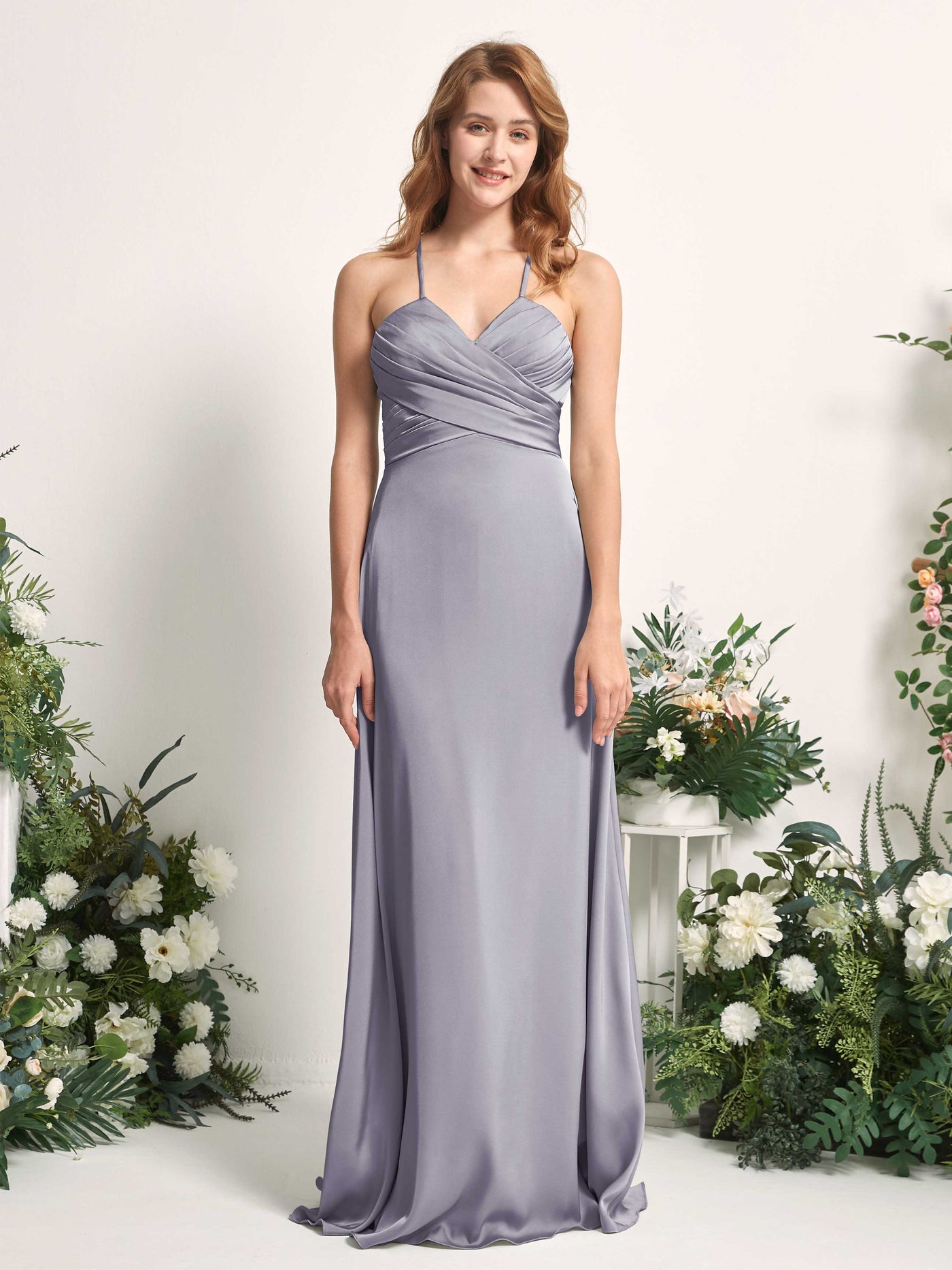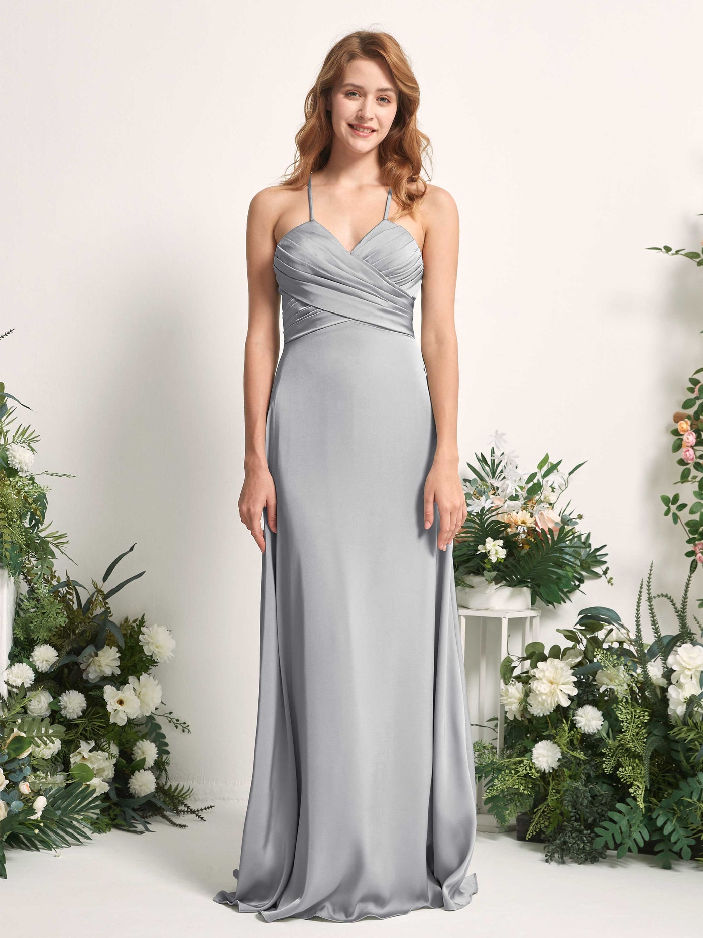 Carlyna Allison A-Line Steel Gray Satin Bridesmaid Dress Maxi Sleeveless V-Neck Dress Front View