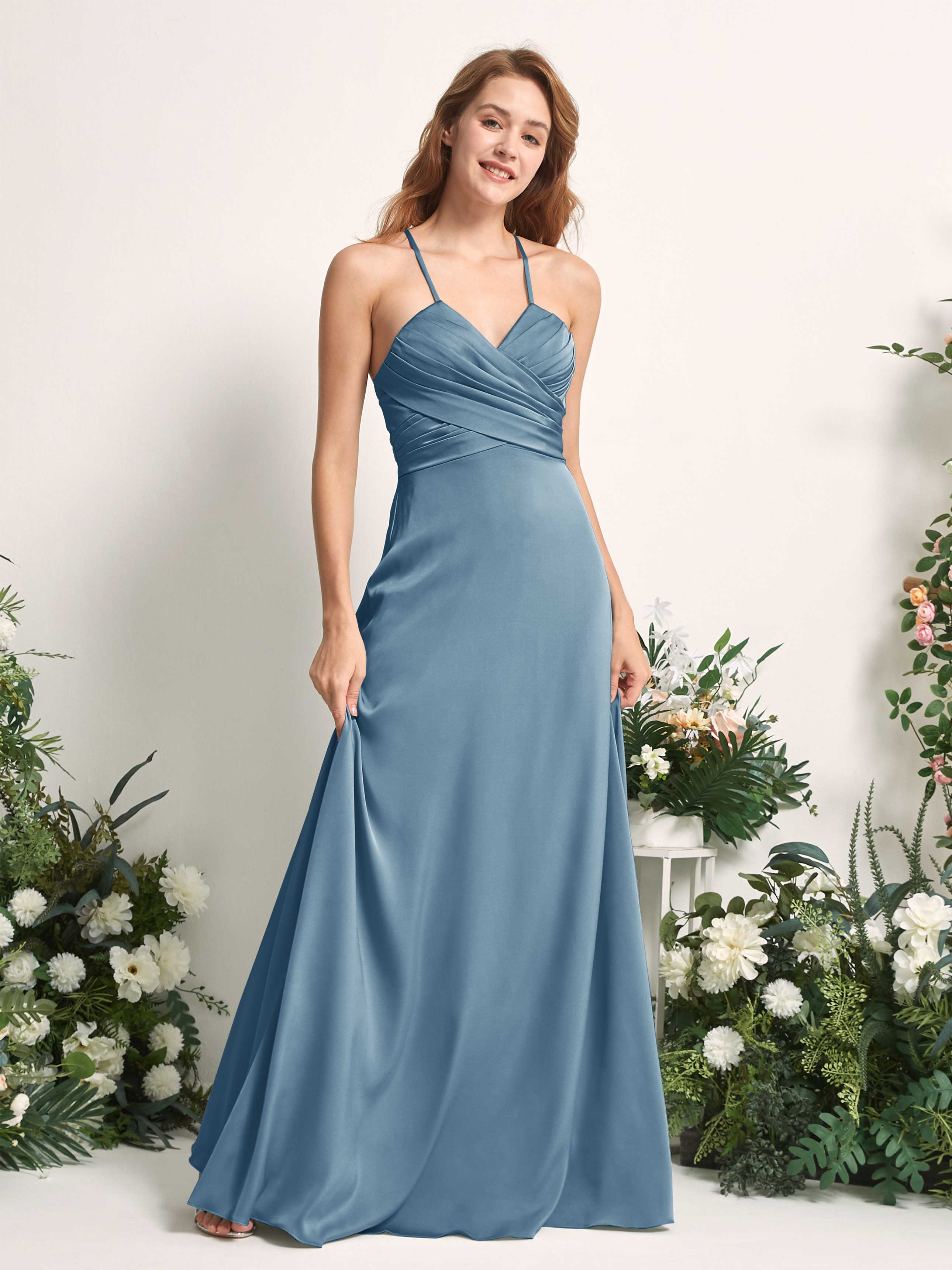 Carlyna Allison A-Line Dusty Blue Satin Bridesmaid Dress Maxi Sleeveless V-Neck Dress Front View