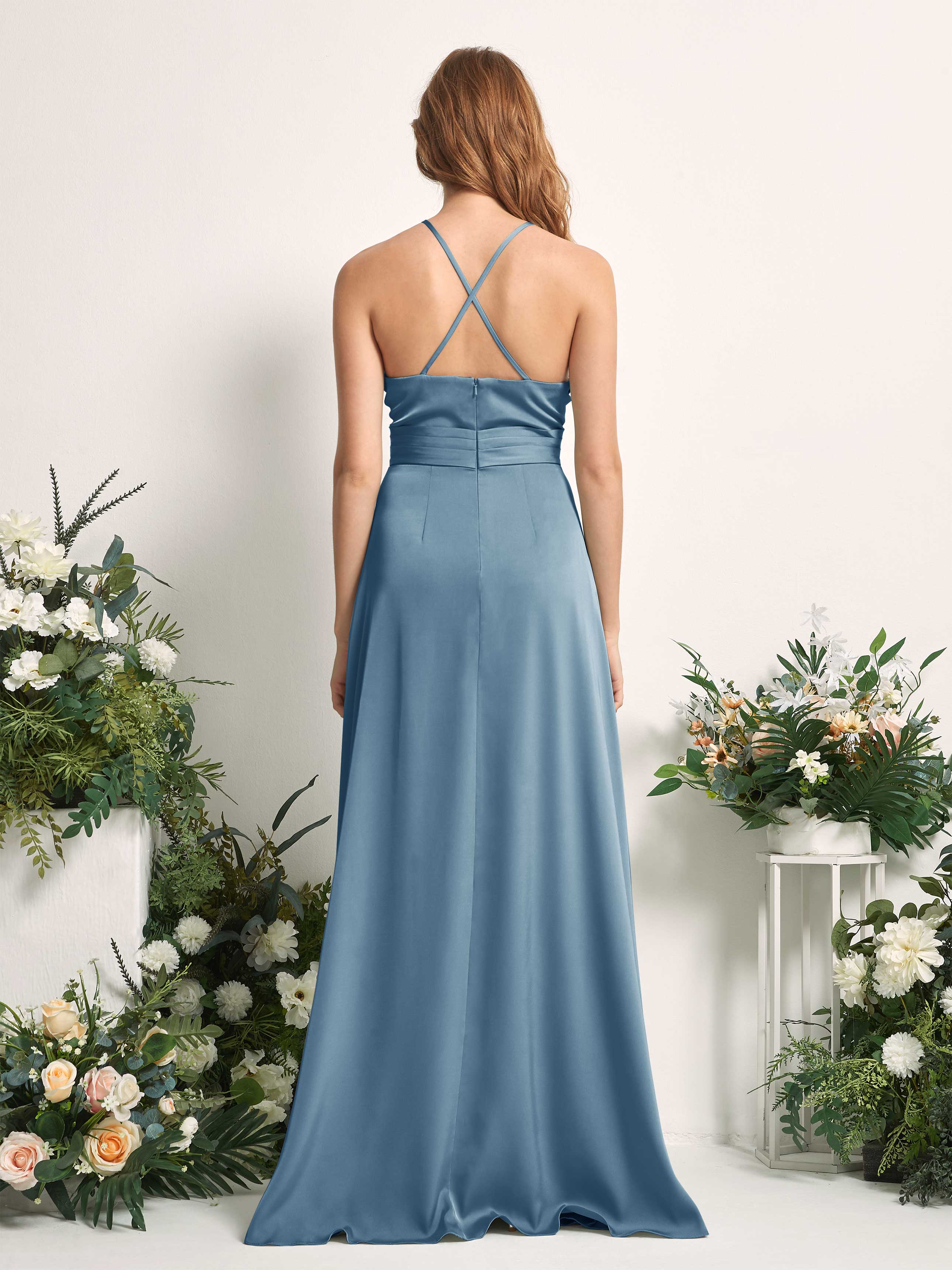Carlyna Allison A-Line Dusty Blue Satin Bridesmaid Dress Maxi Sleeveless V-Neck Dress Back View