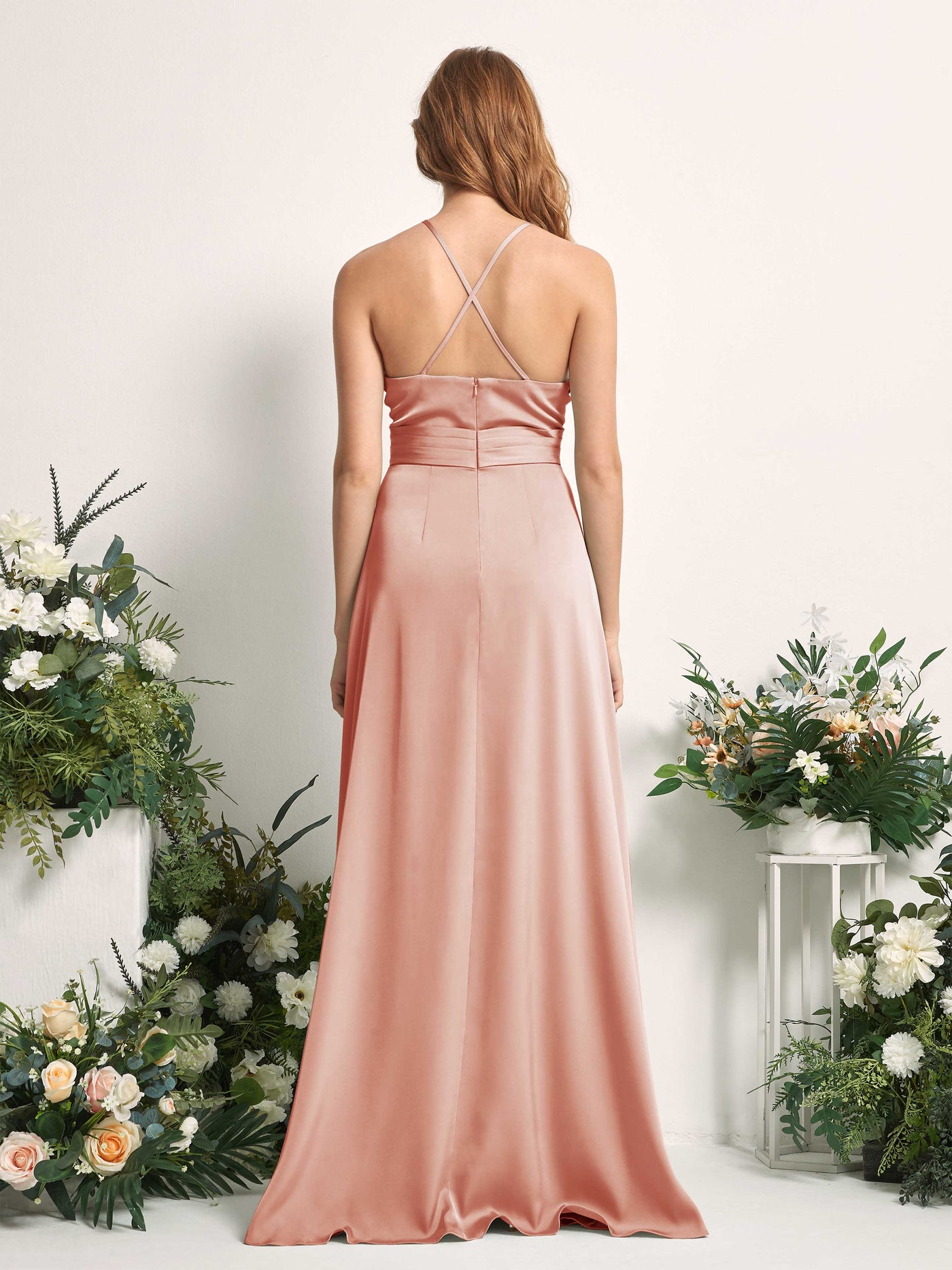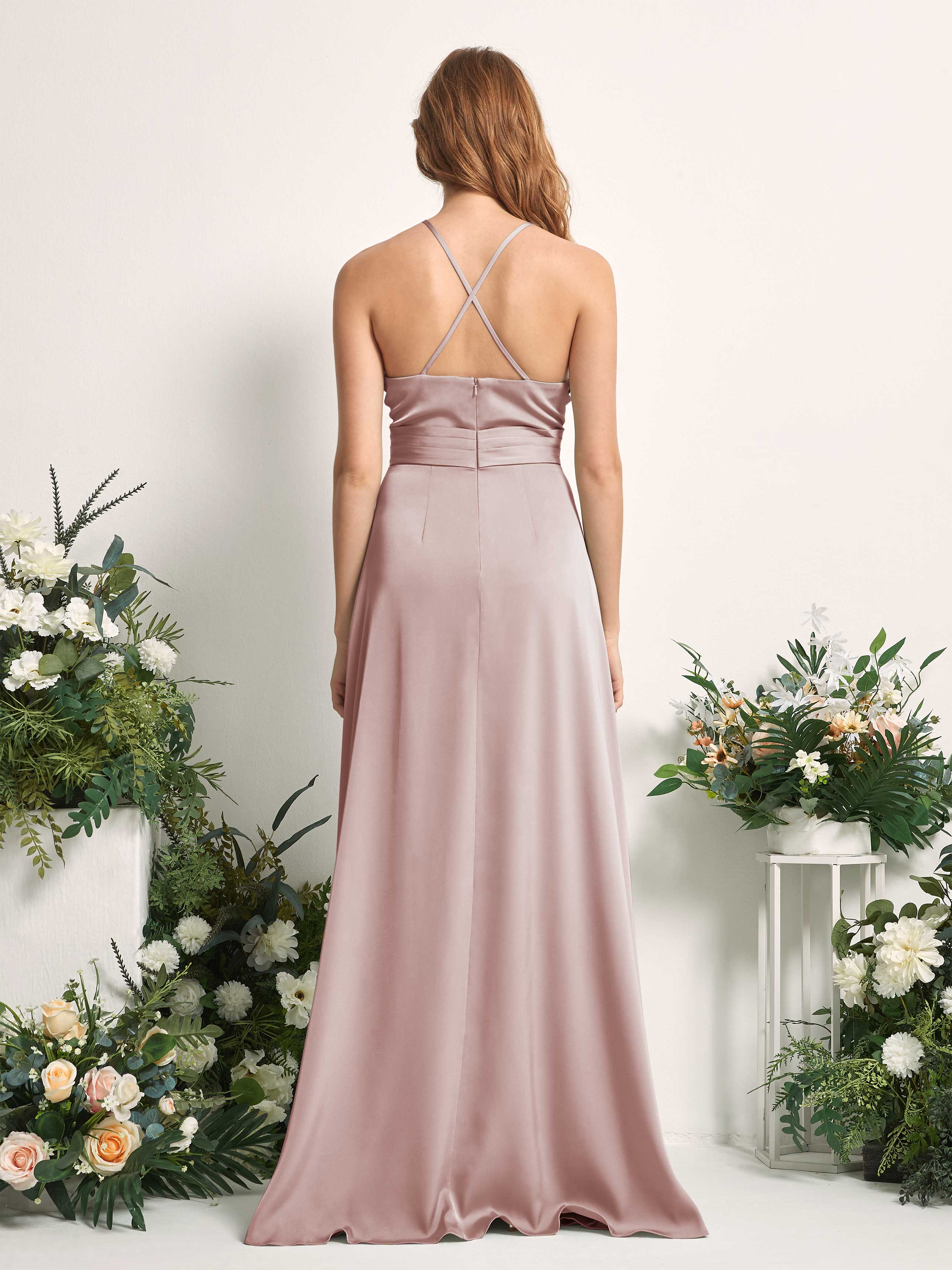 Carlyna Allison A-Line Desert Rose Satin Bridesmaid Dress Maxi Sleeveless V-Neck Dress Back View