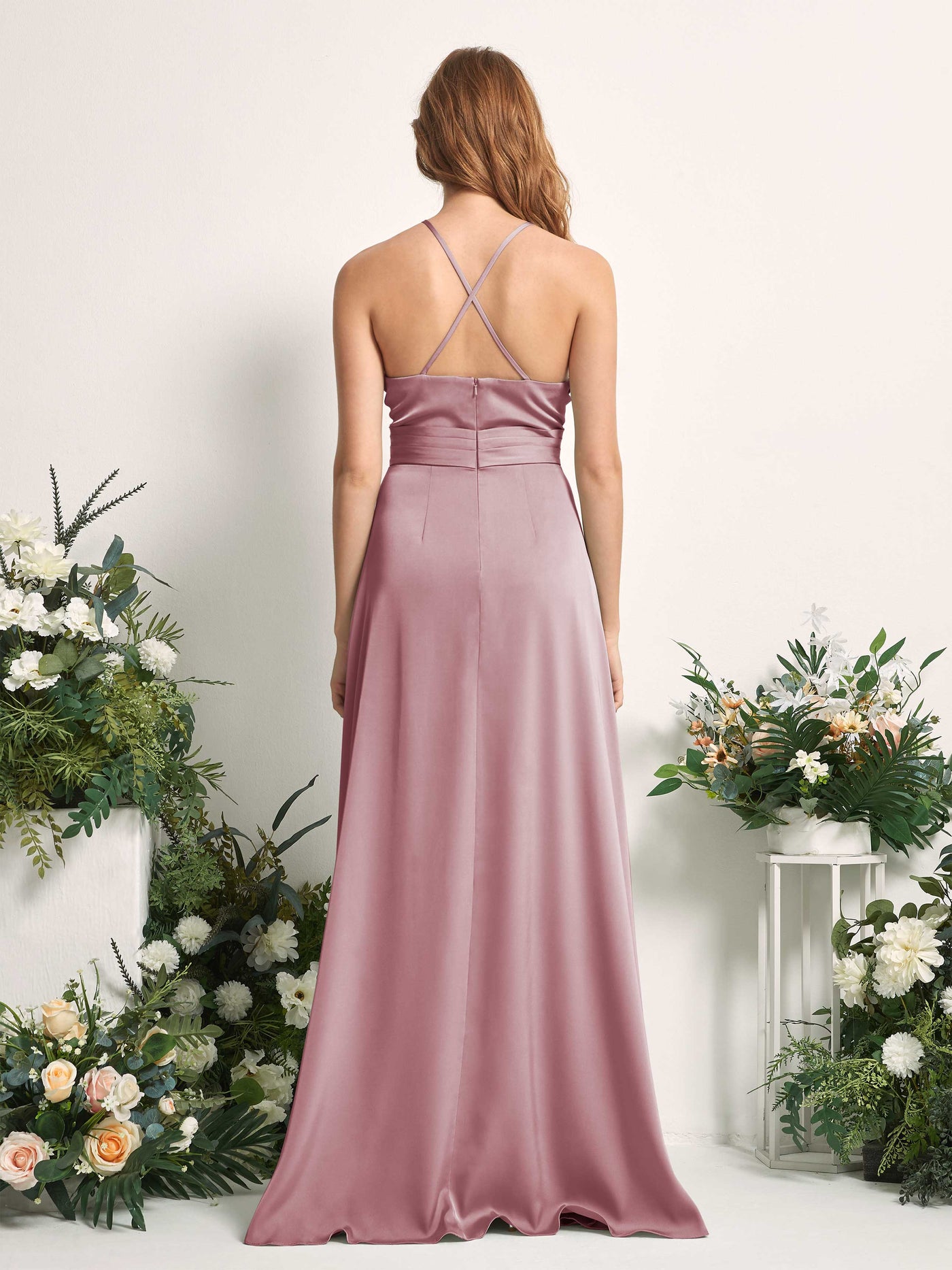 Carlyna Allison A-Line Dusty Rose Satin Bridesmaid Dress Maxi Sleeveless V-Neck Dress Back View