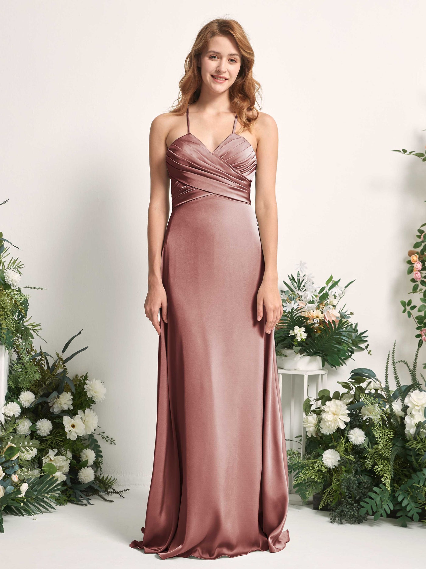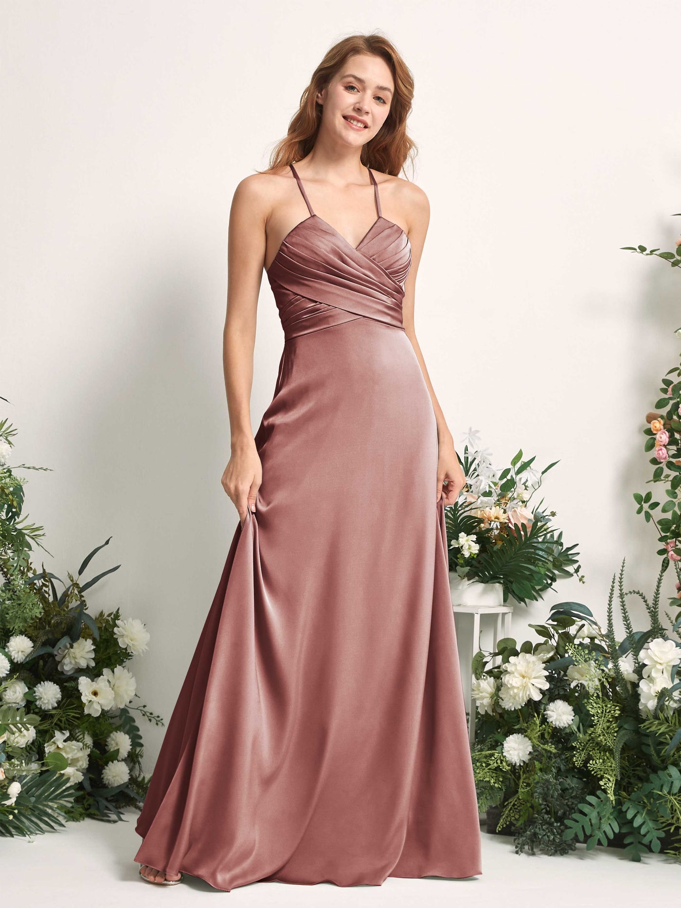 Carlyna Allison A-Line Dusty Rose Satin Bridesmaid Dress Maxi Sleeveless V-Neck Dress Front View