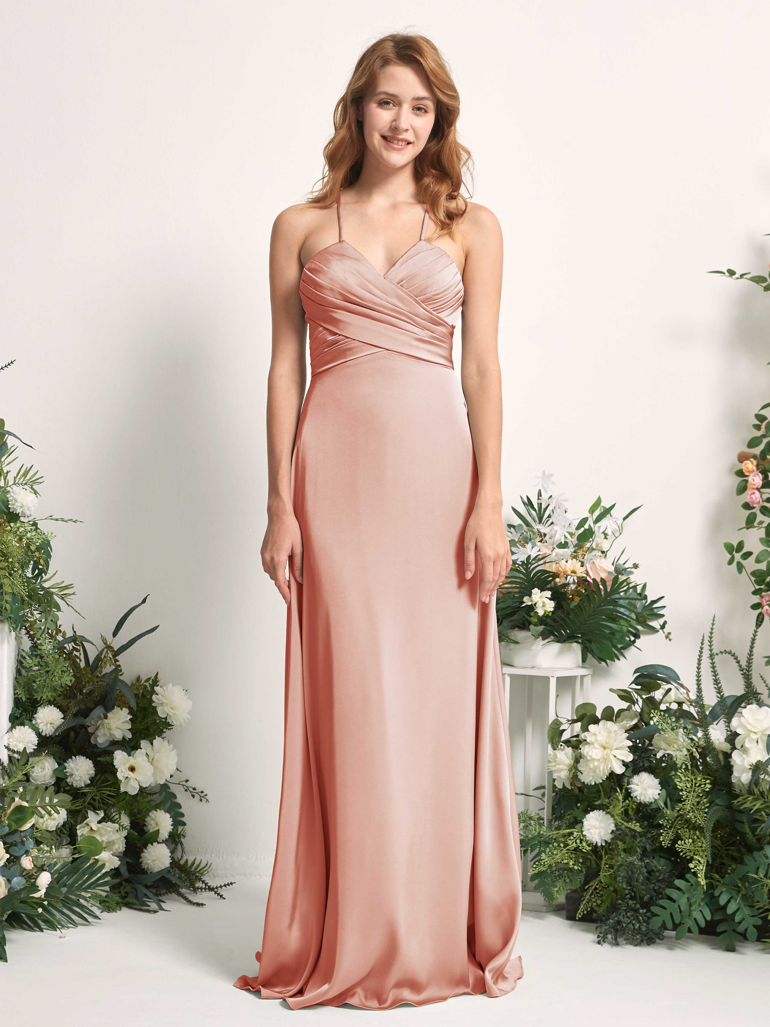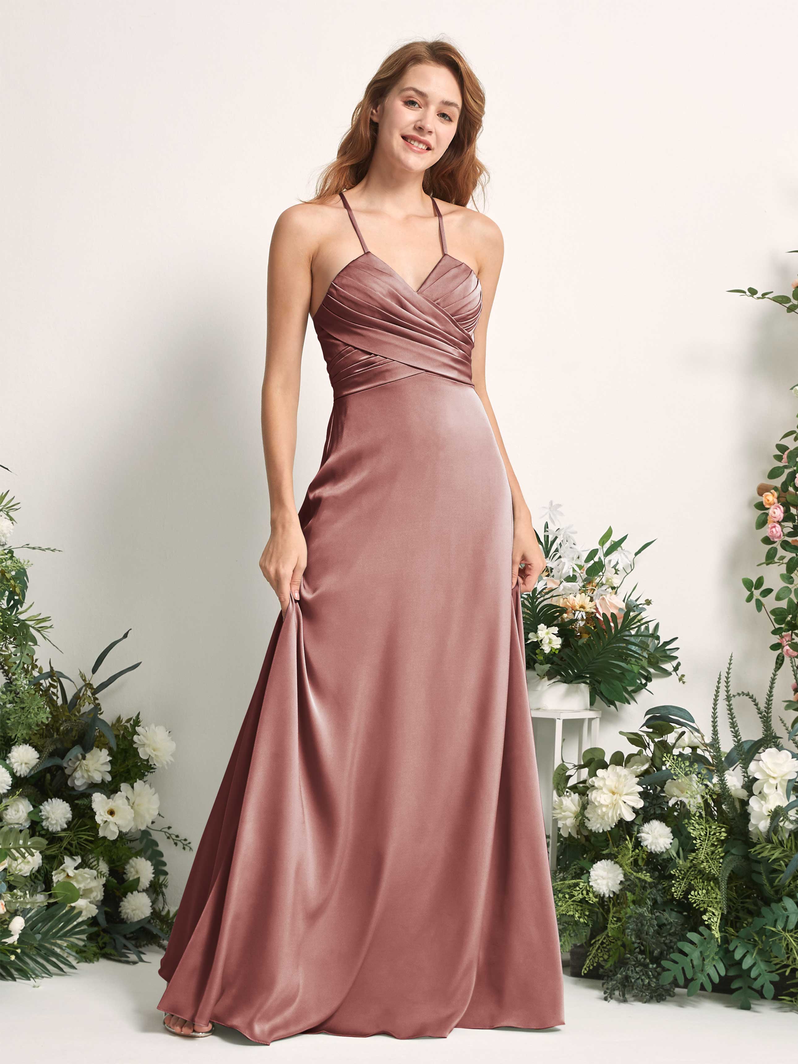 Carlyna Allison A-Line Desert Rose Satin Bridesmaid Dress Maxi Sleeveless V-Neck Dress Front View