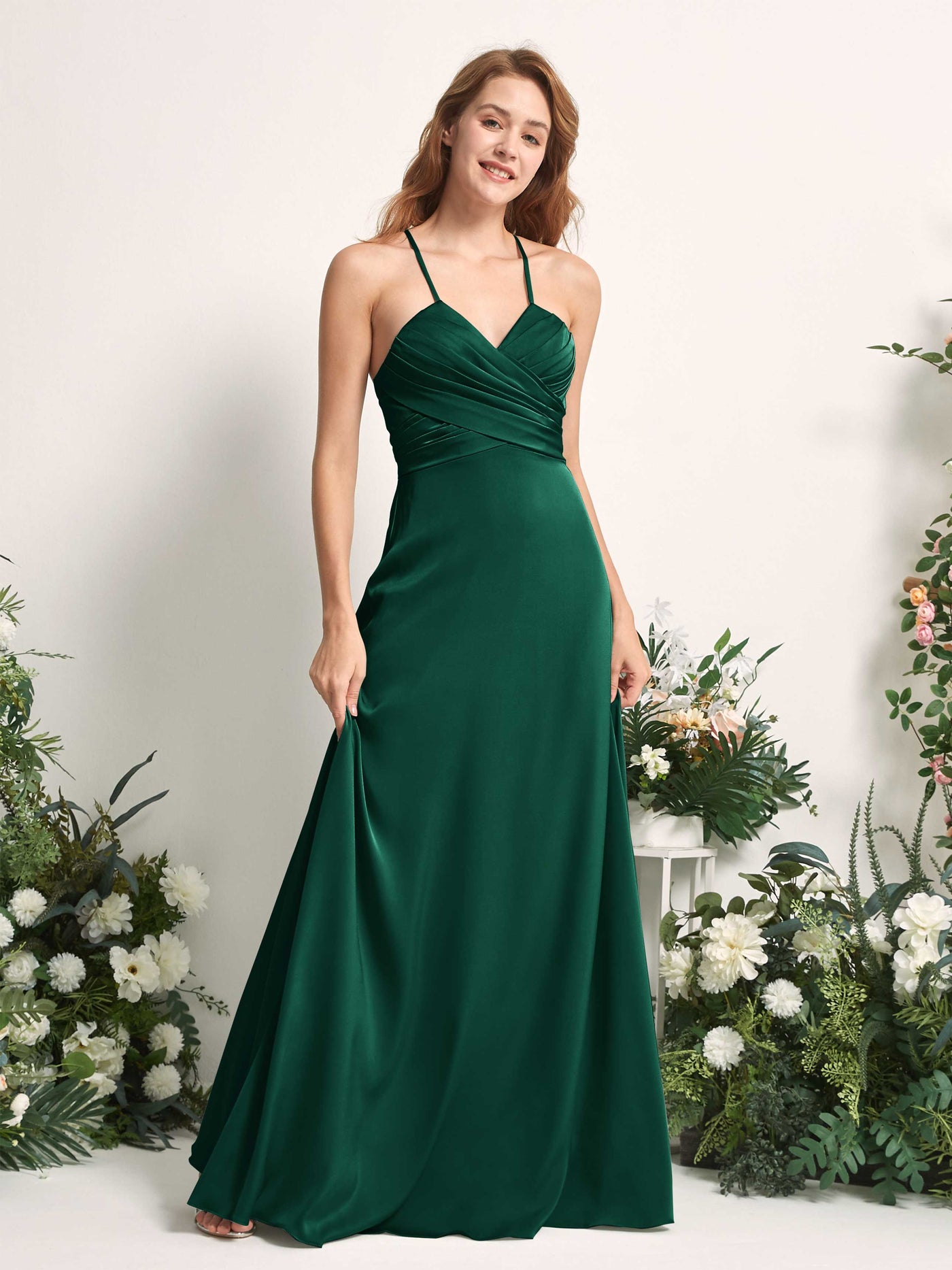 Carlyna Allison A-Line Hunter Green Satin Bridesmaid Dress Maxi Sleeveless V-Neck Dress Front View