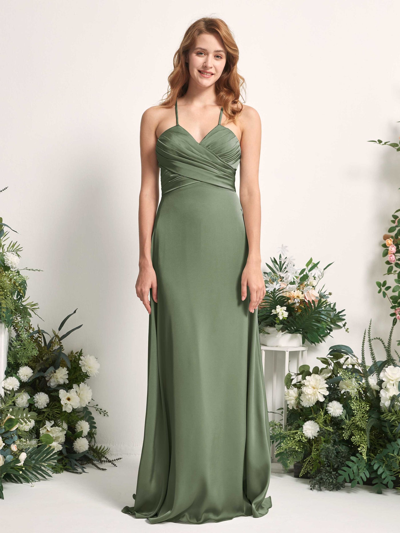 Carlyna Allison A-Line Green Olive Satin Bridesmaid Dress Maxi Sleeveless V-Neck Dress Front View
