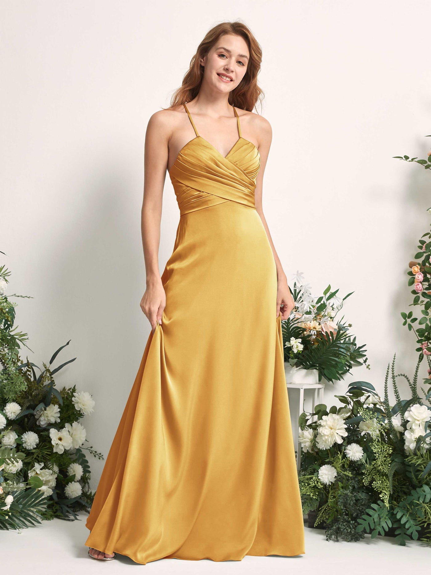 Carlyna Allison A-Line Canary Satin Bridesmaid Dress Maxi Sleeveless V-Neck Dress Front View