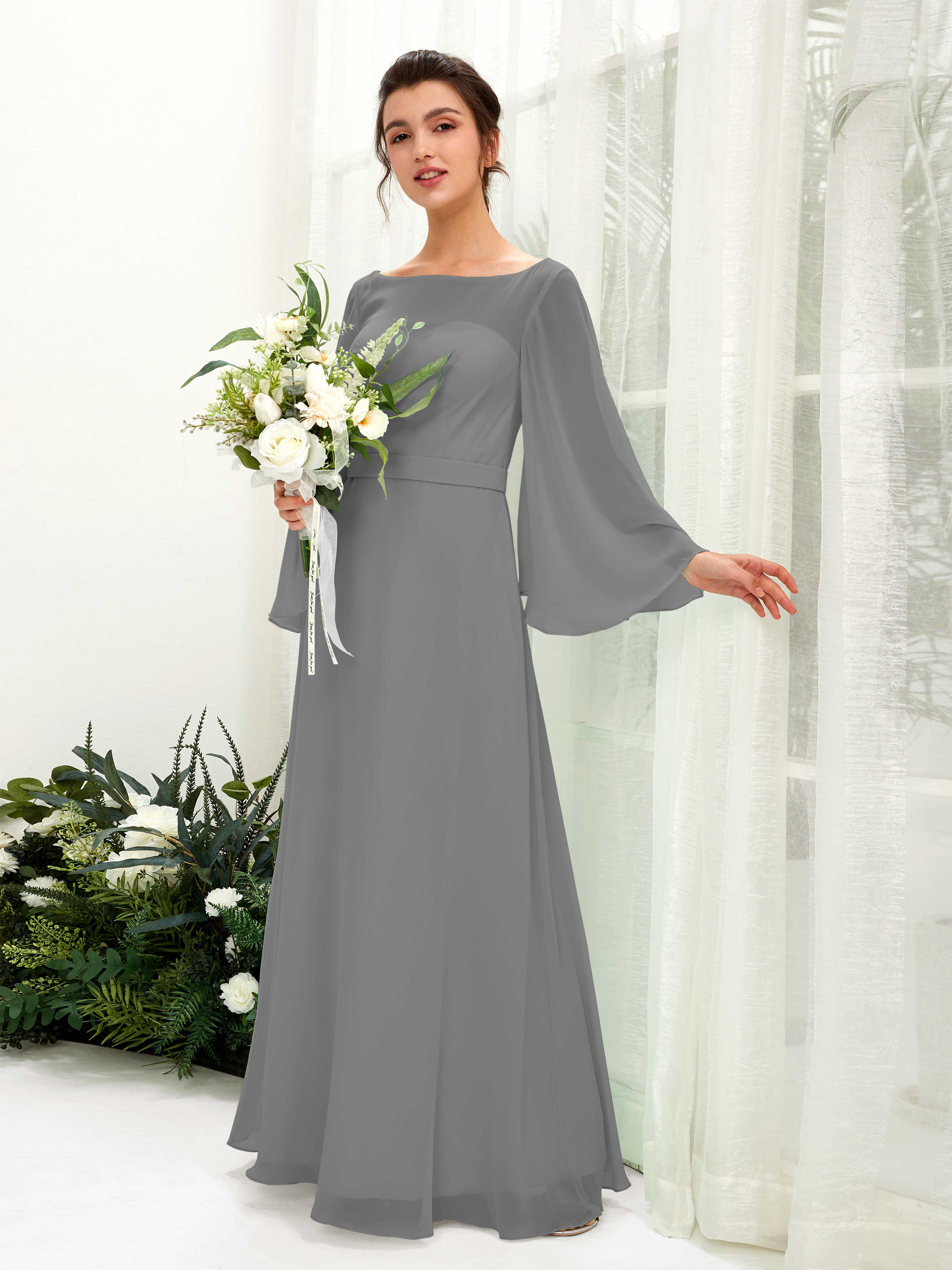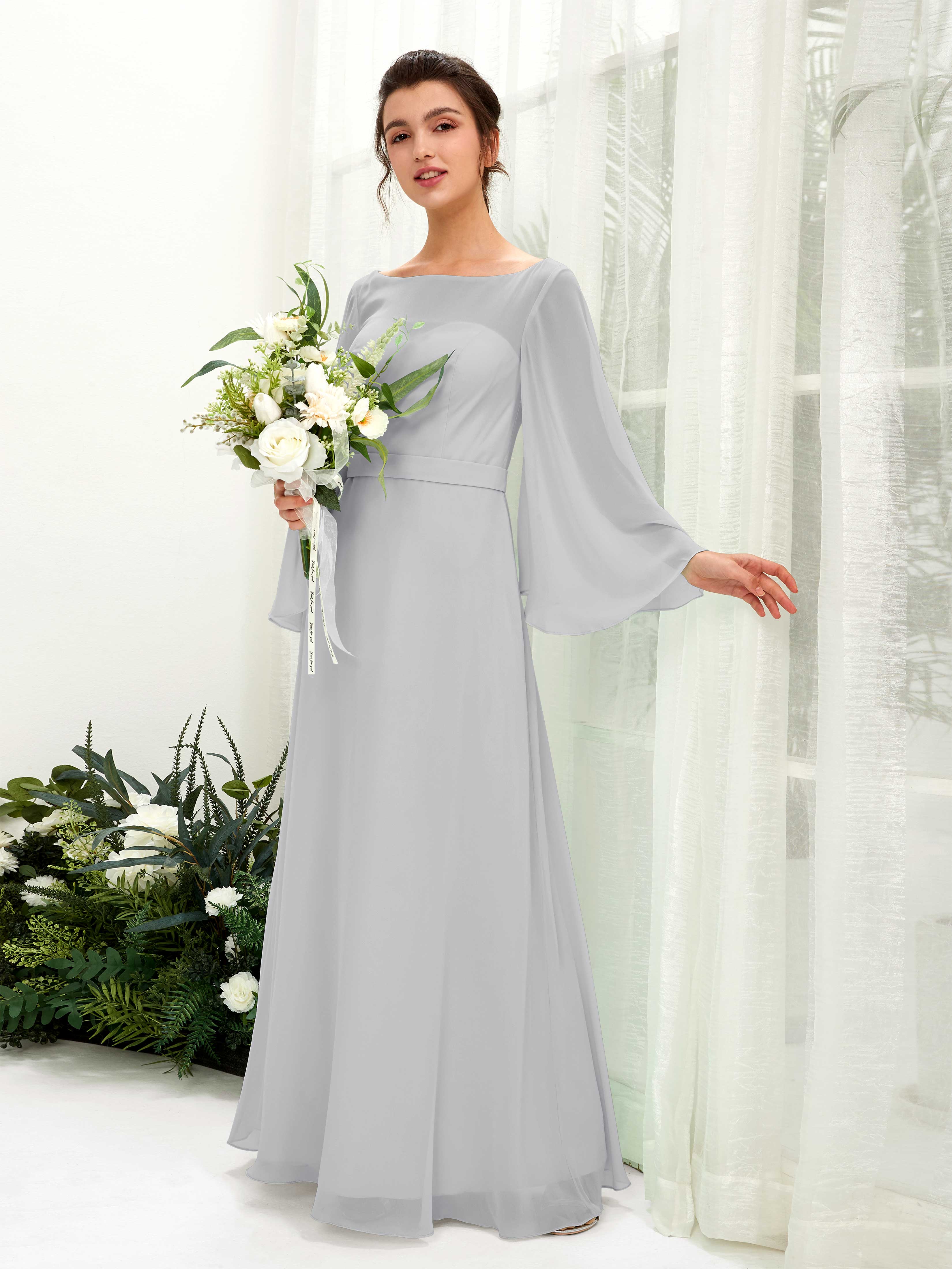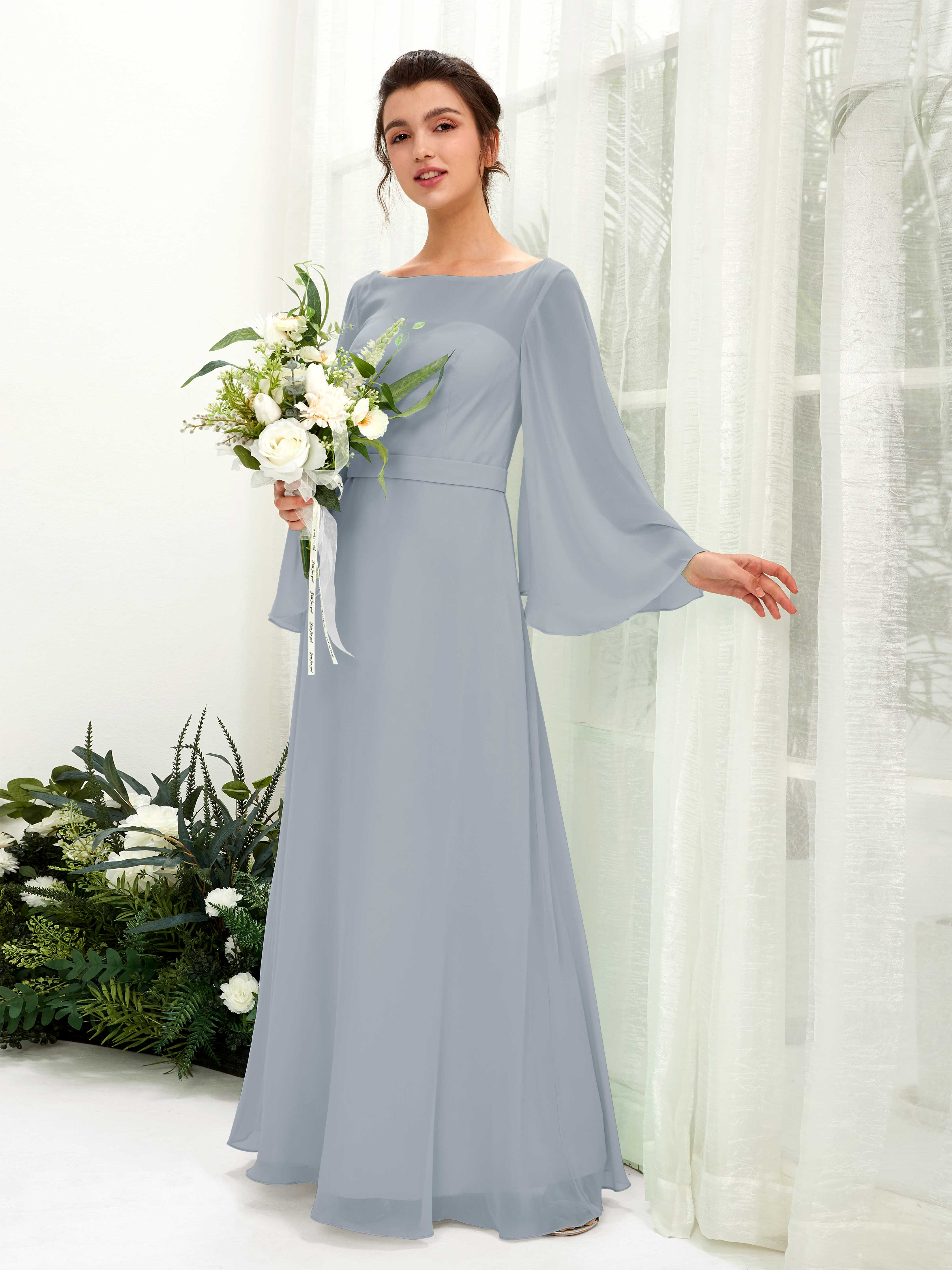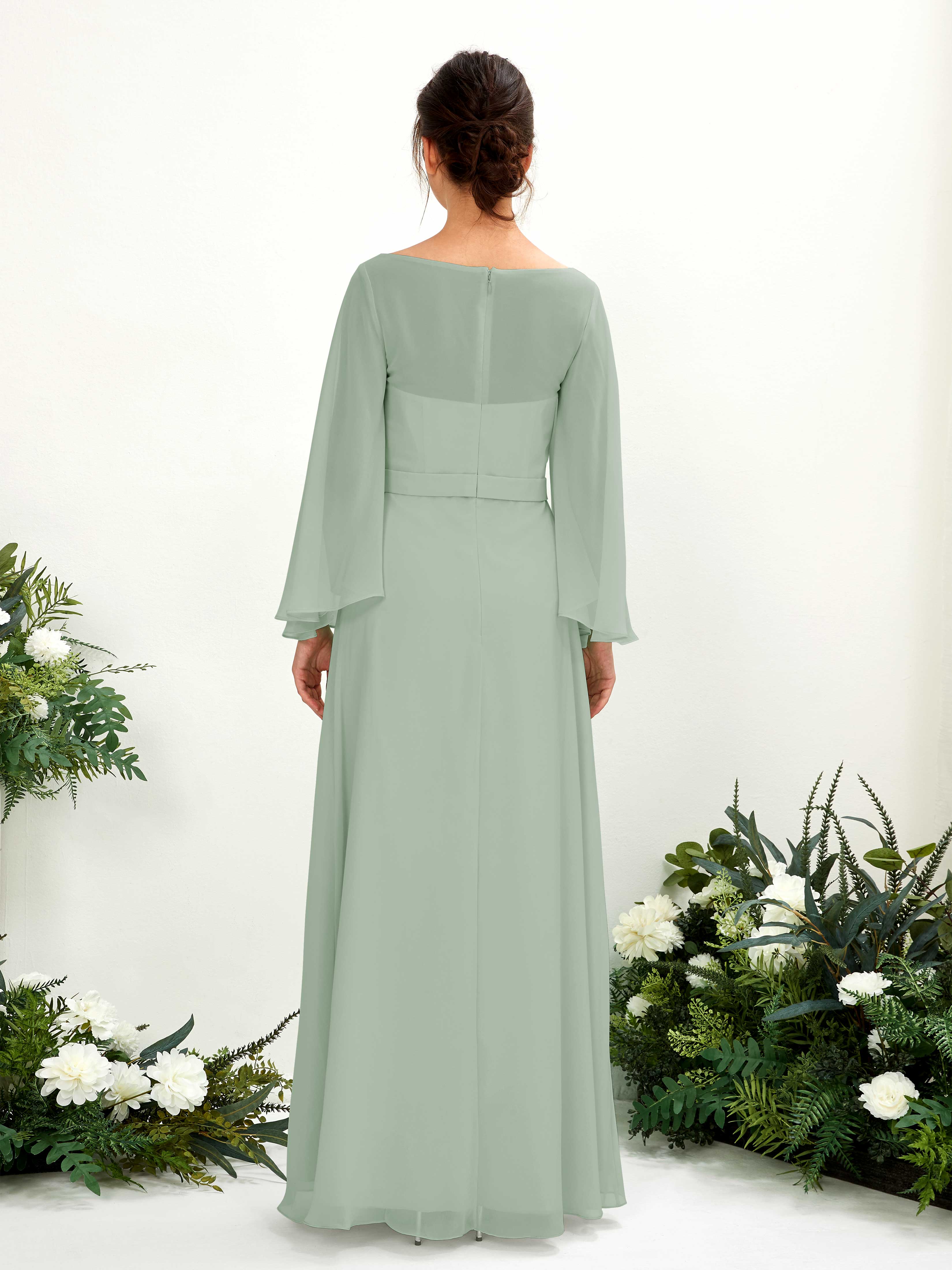 Sage Green Chiffon A-Line Boat Neck Long Sleeve Maxi Dress