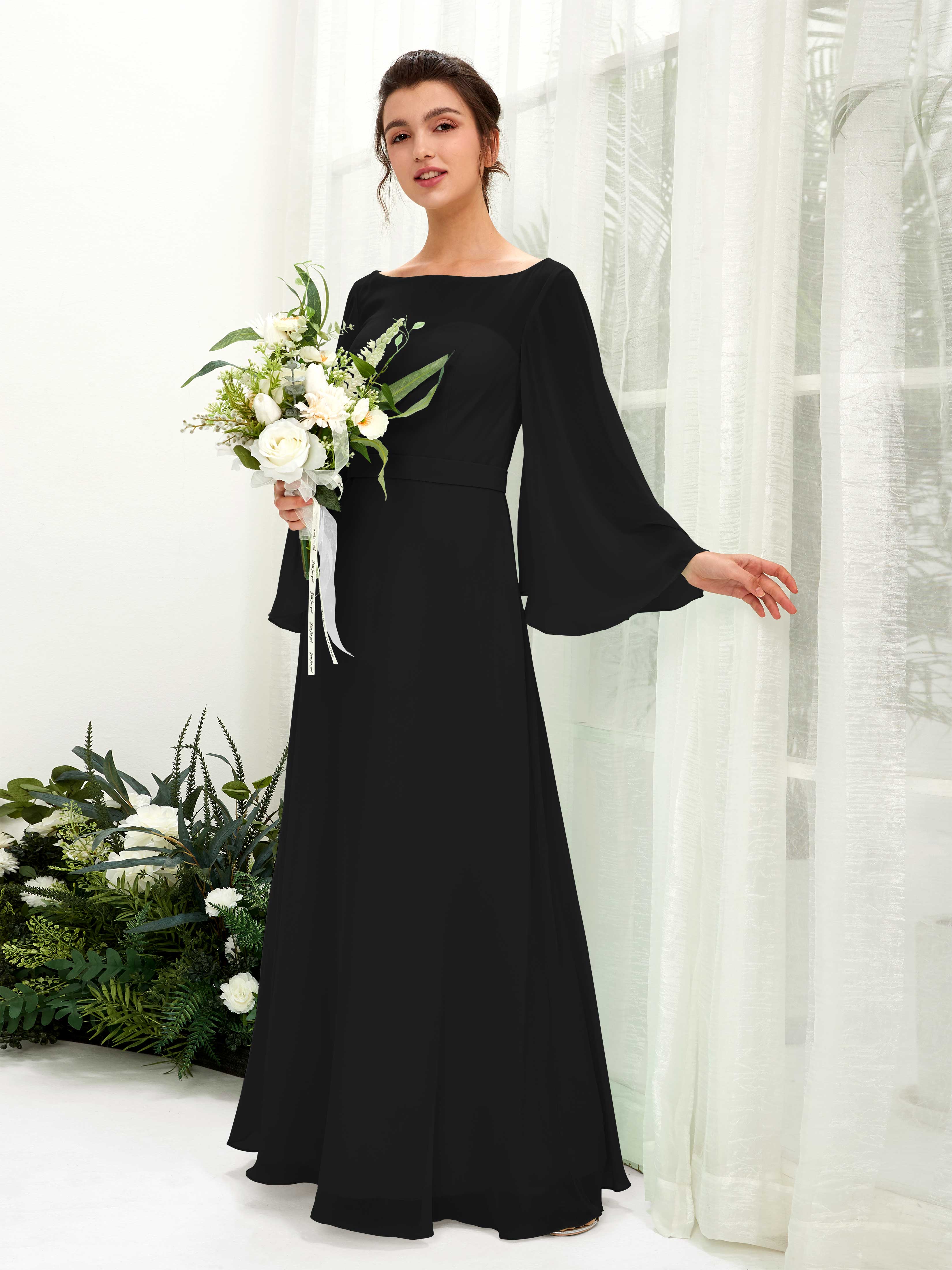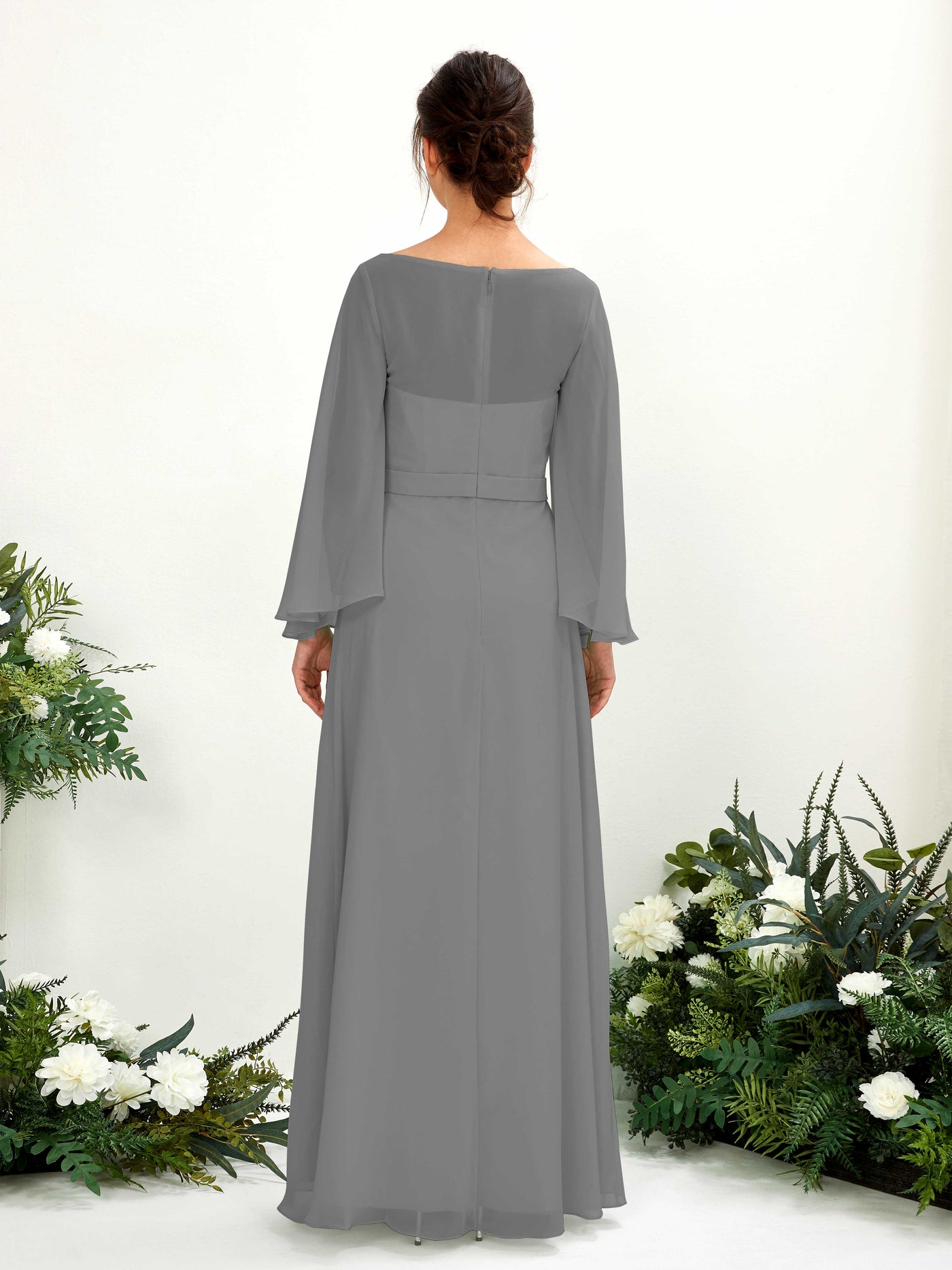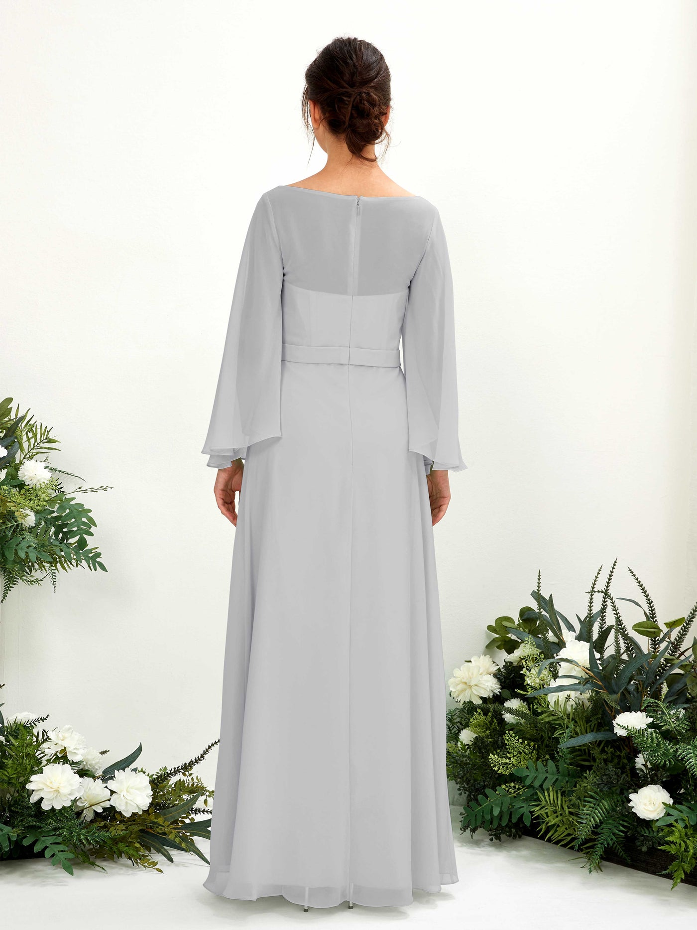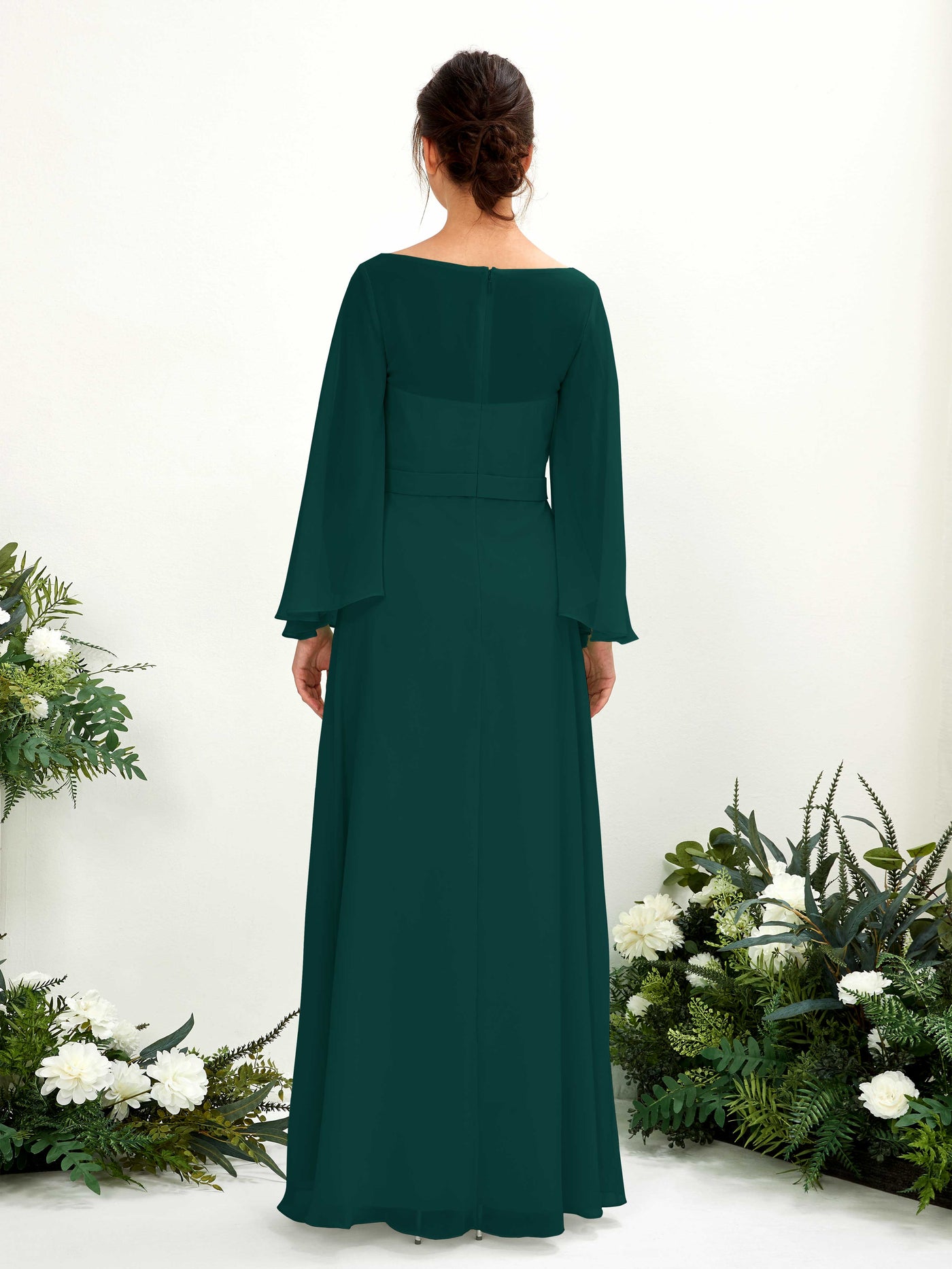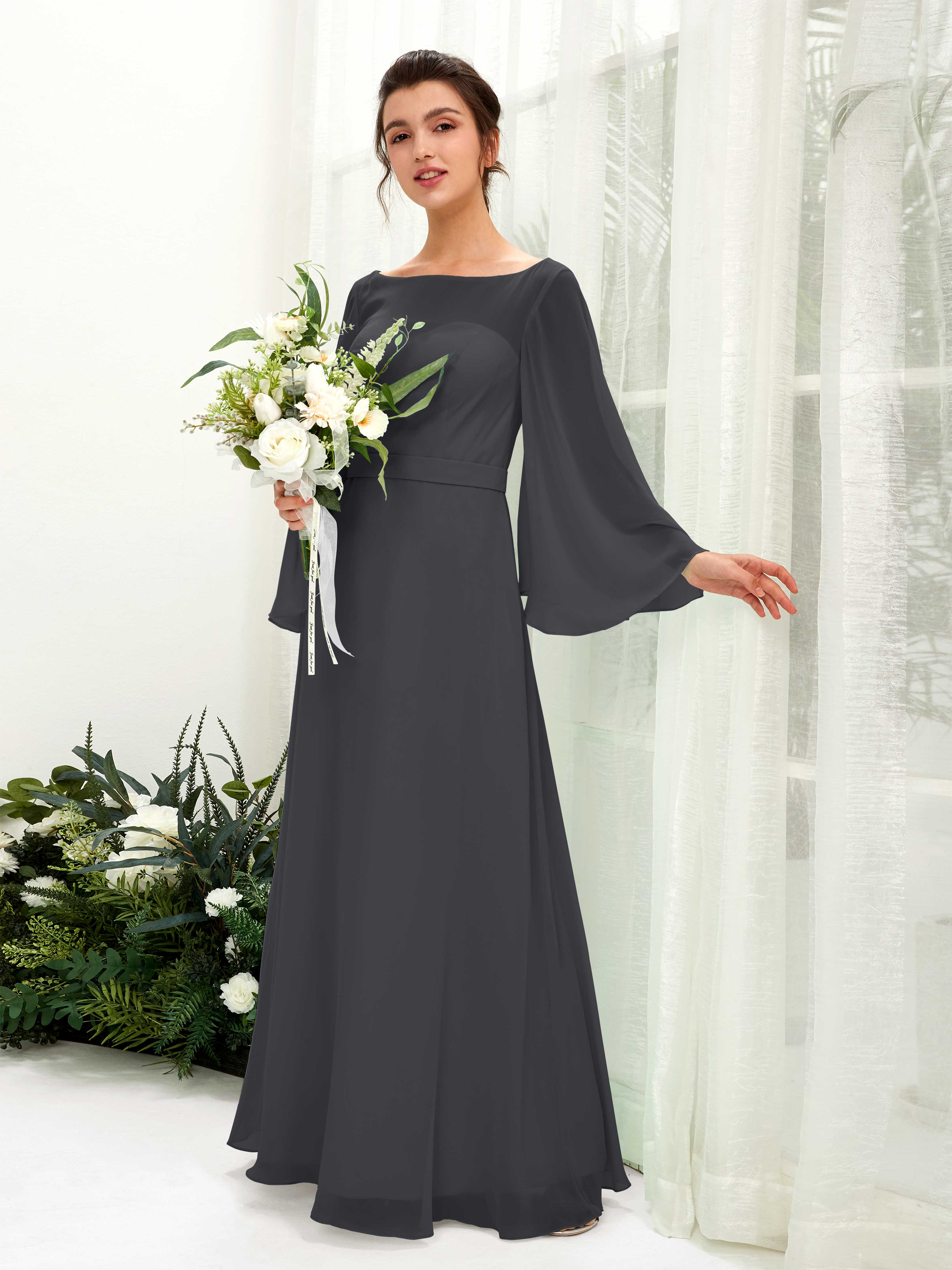 Sage Green Chiffon A-Line Boat Neck Long Sleeve Maxi Dress