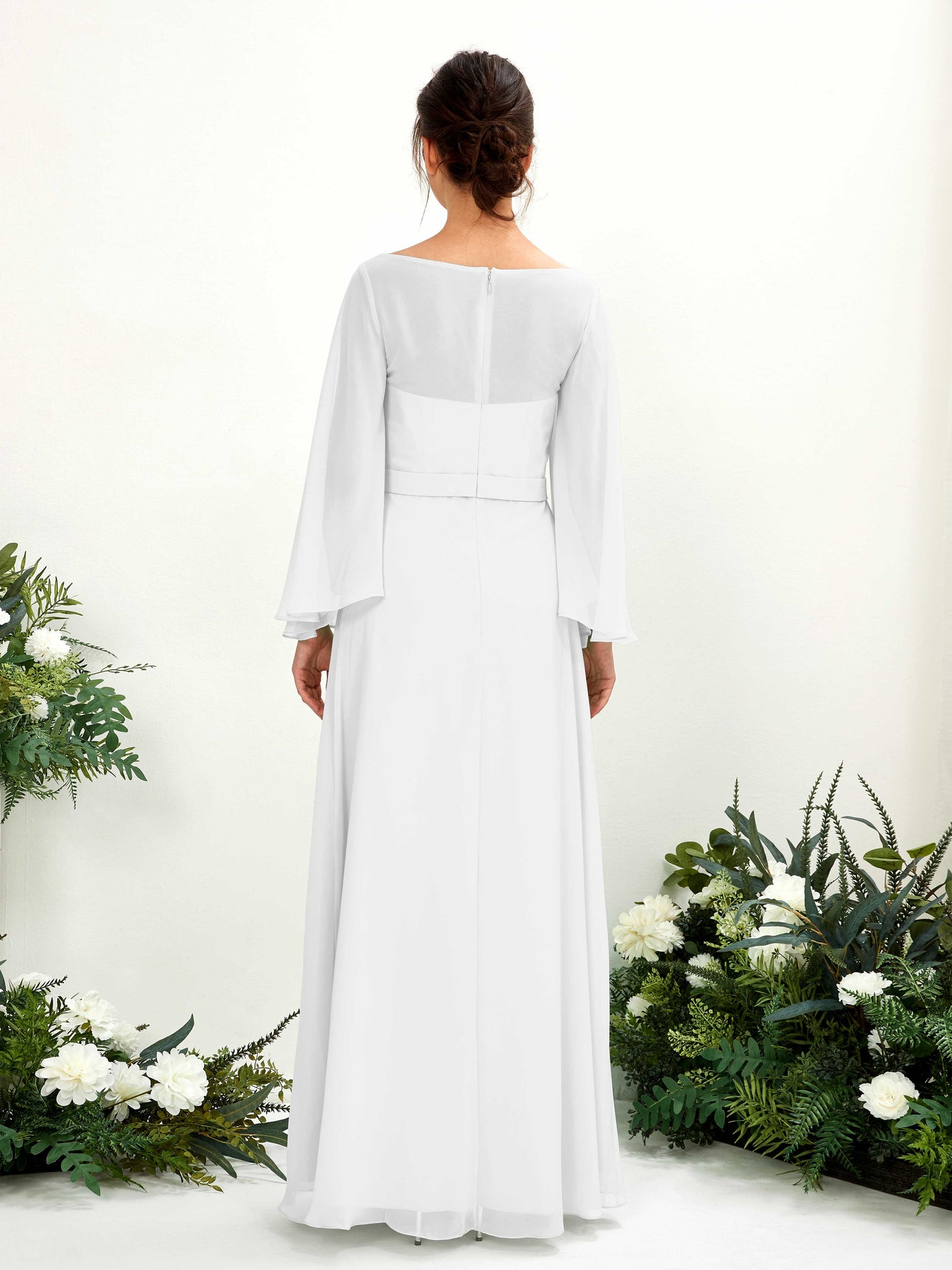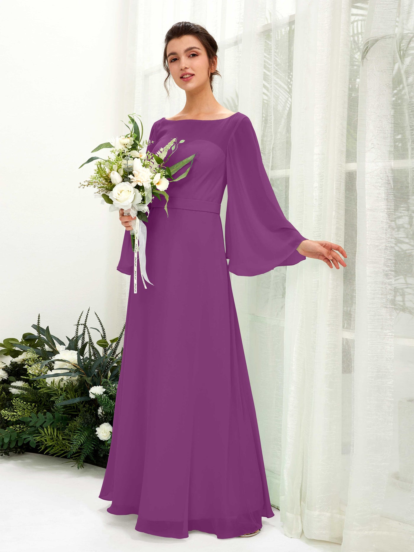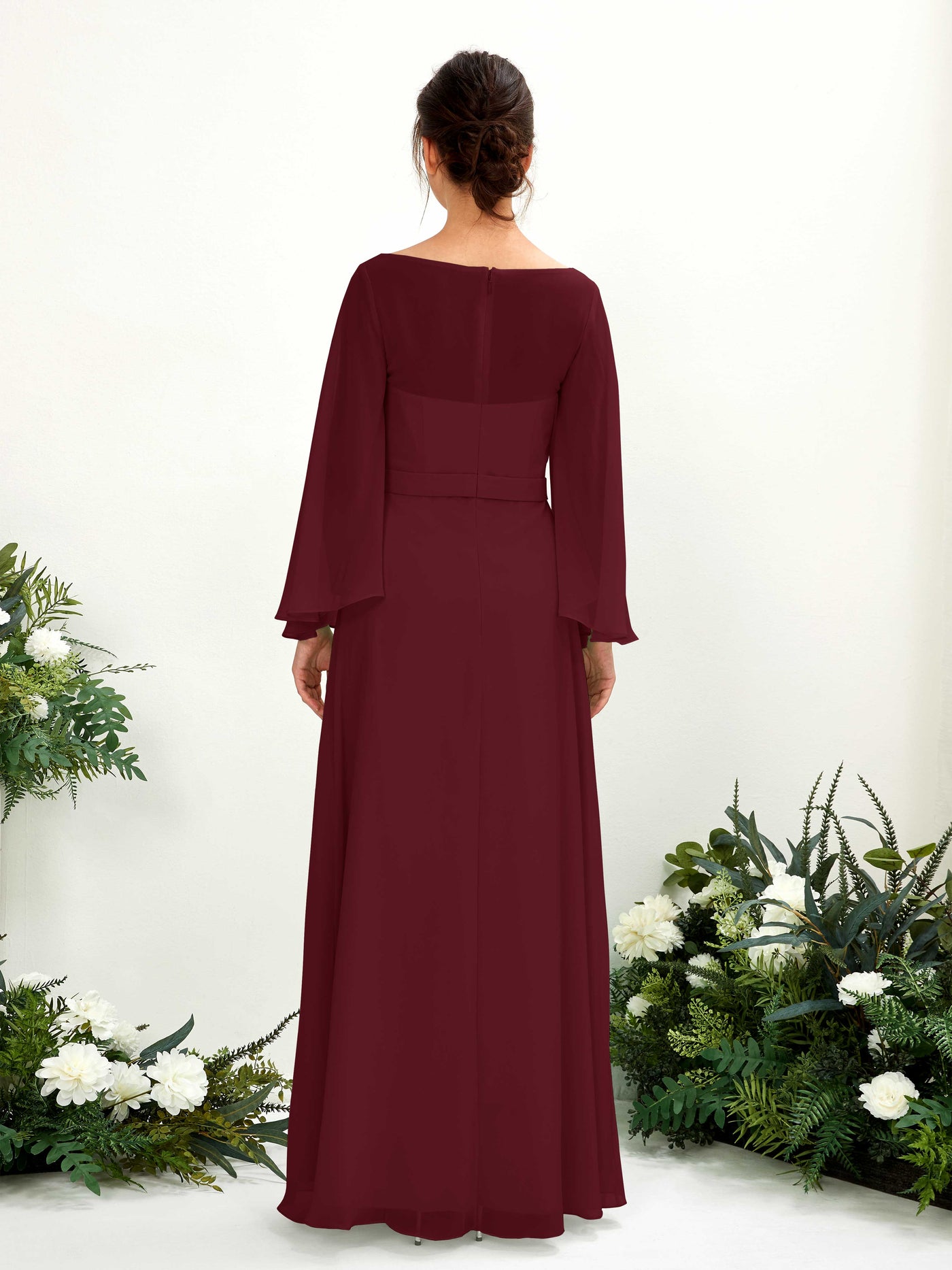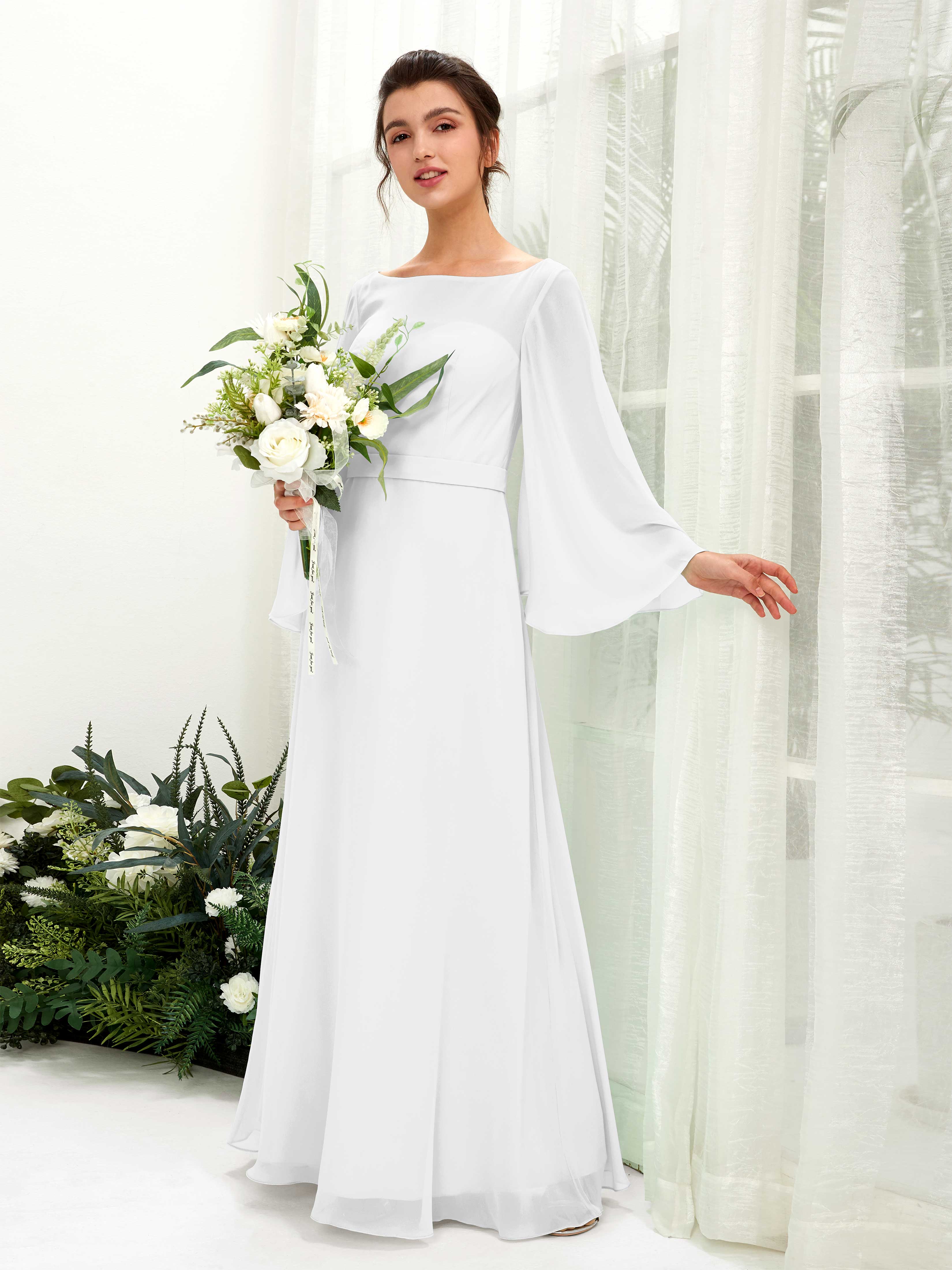 Sage Green Chiffon A-Line Boat Neck Long Sleeve Maxi Dress
