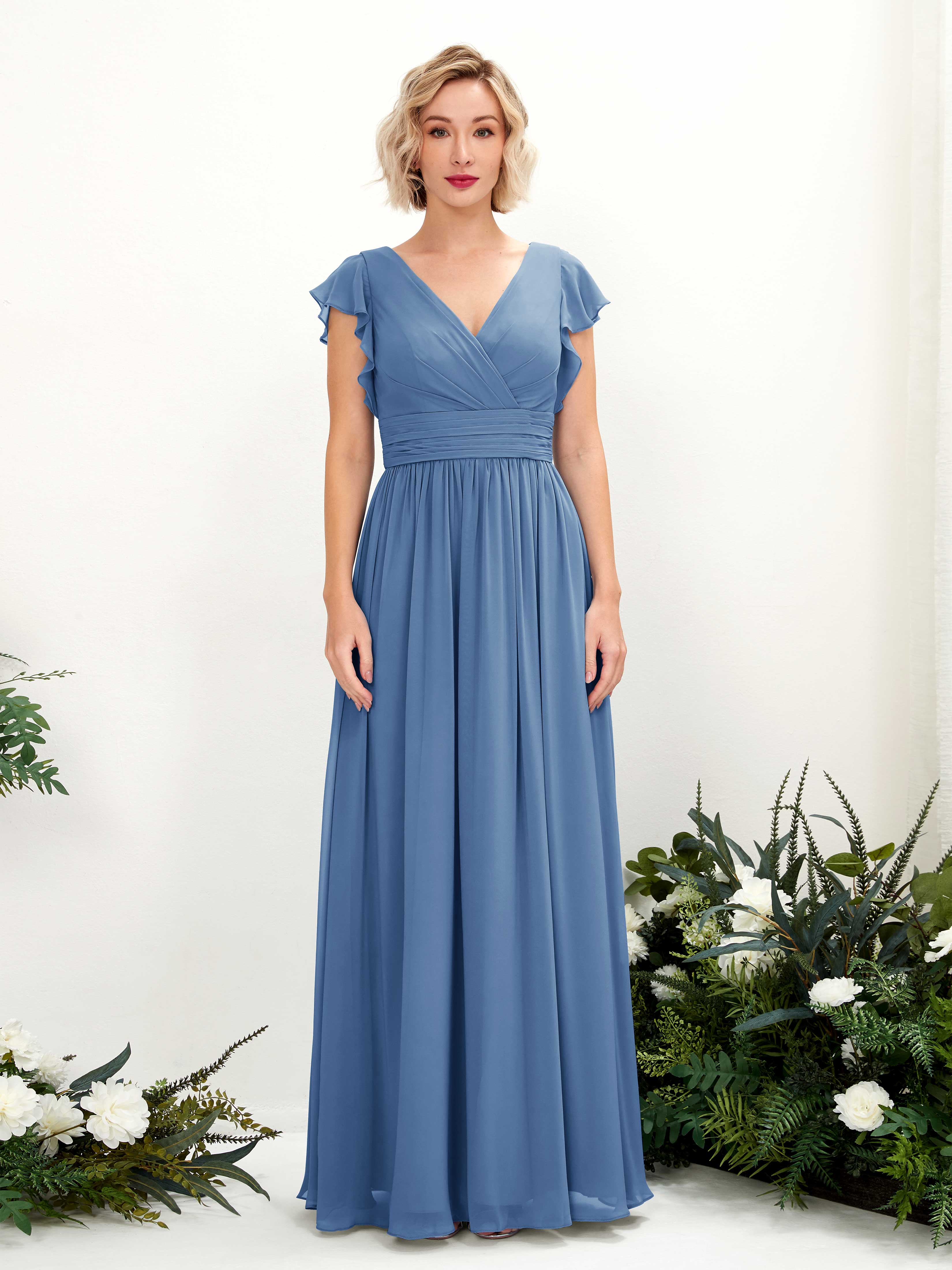 Dusty Blue Chiffon A-Line V-Neck Maxi Dress