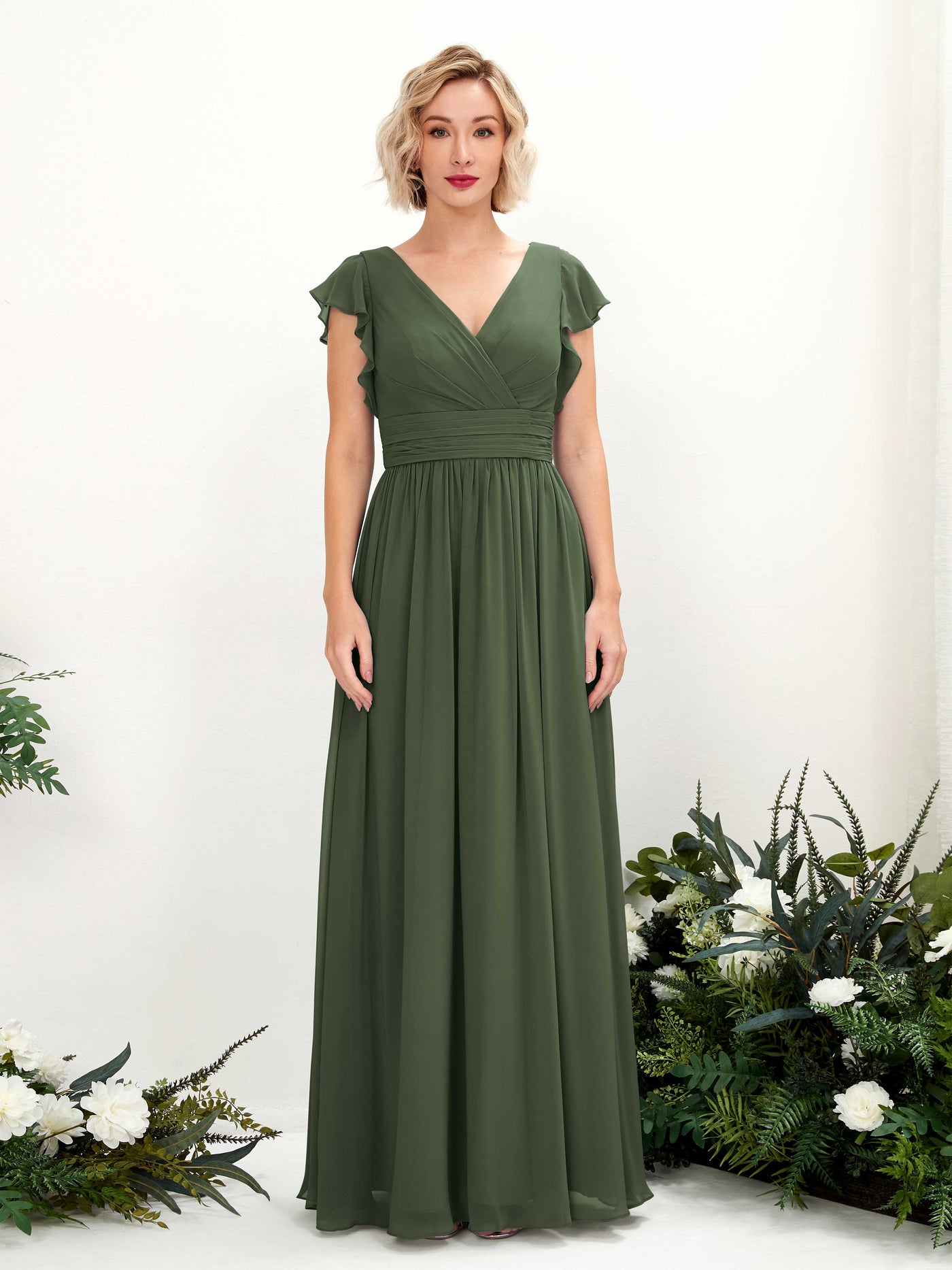 Carlyna Grino A-Line Martini Olive Bridesmaid Dress Maxi Cap Sleeve V-Neck Dress Front View