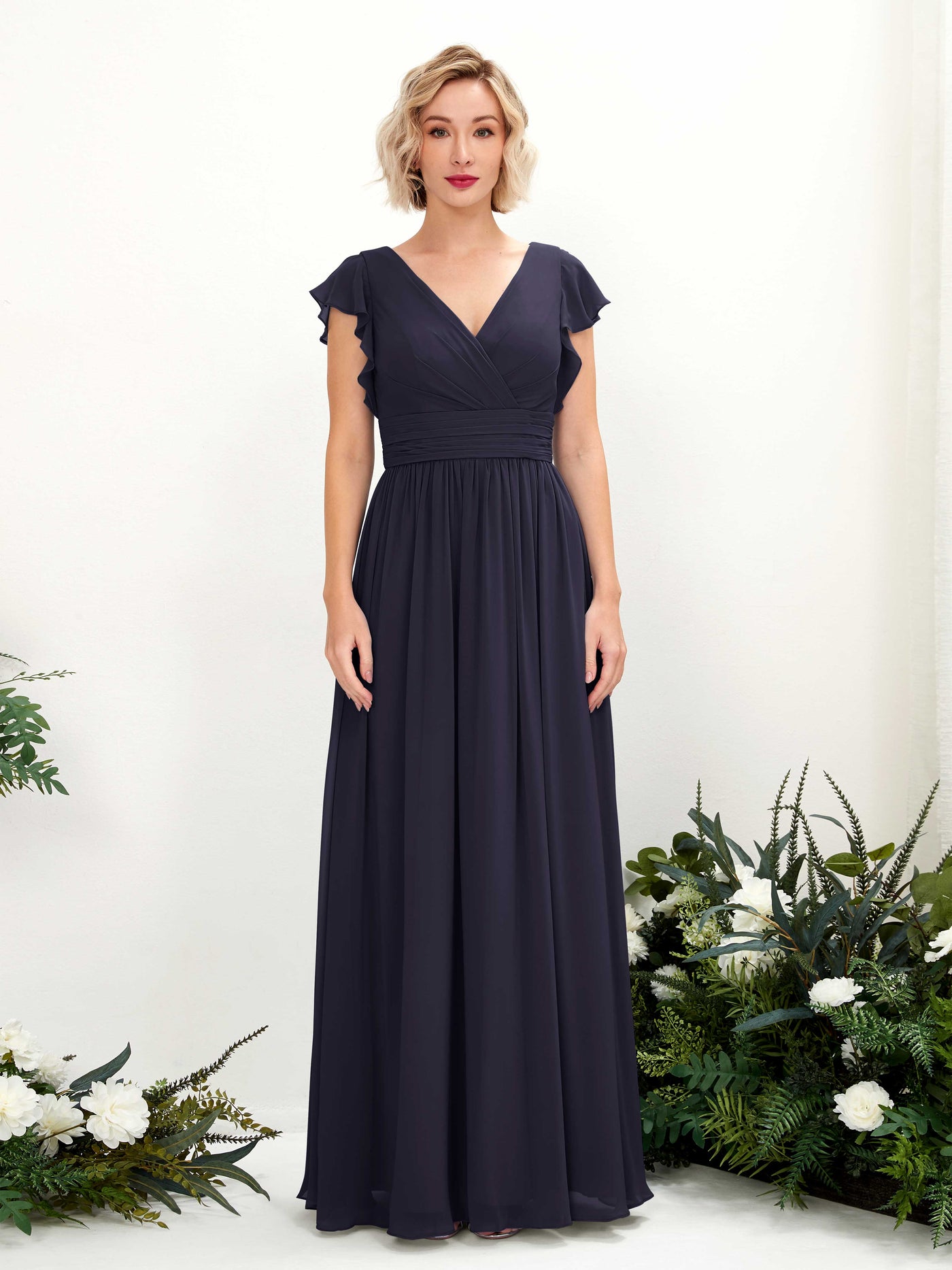 Carlyna Grino A-Line Dark Navy Bridesmaid Dress Maxi Cap Sleeve V-Neck Dress Front View