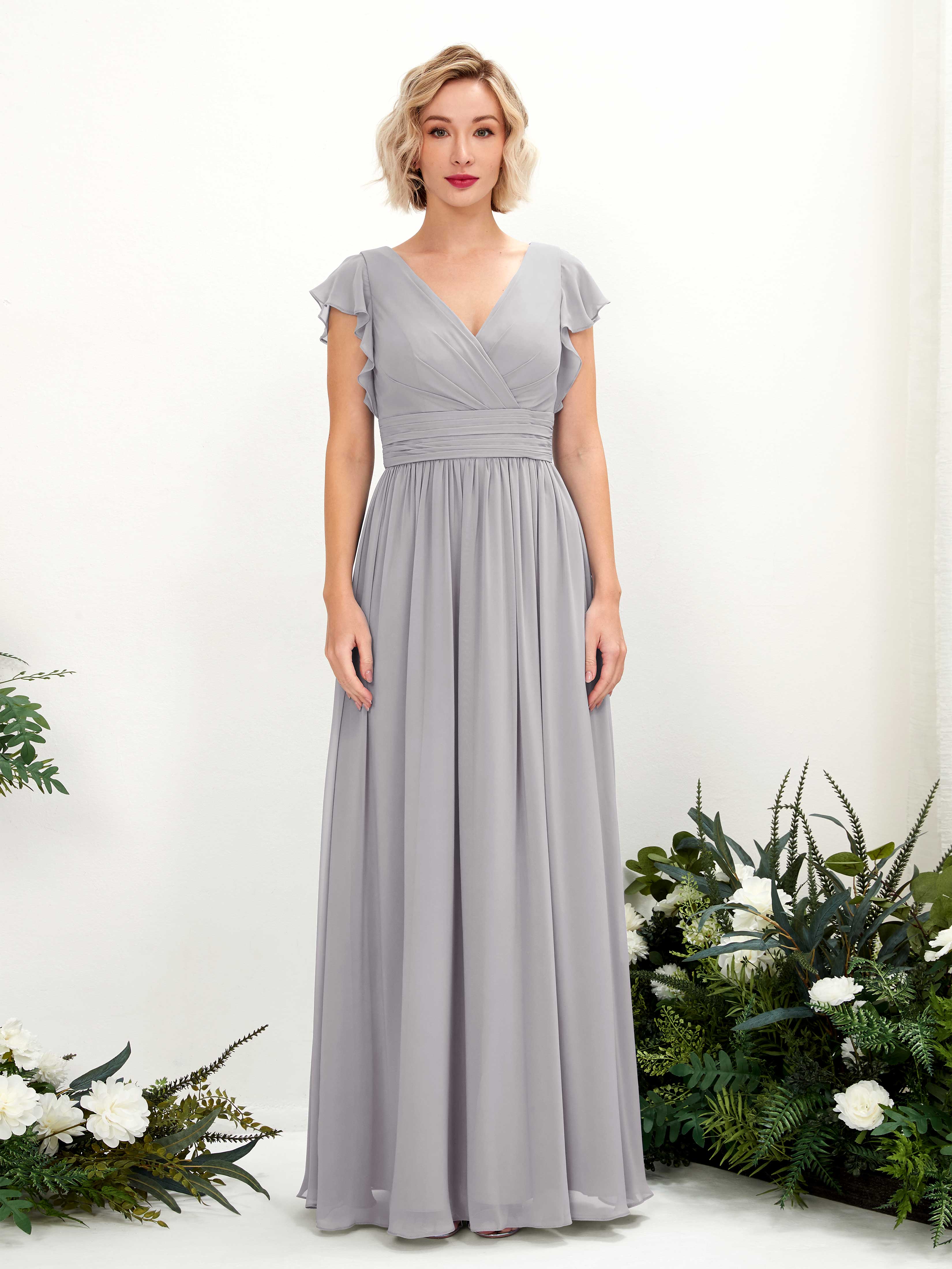 Carlyna Grino A-Line Silver Bridesmaid Dress Maxi Cap Sleeve V-Neck Dress Front View