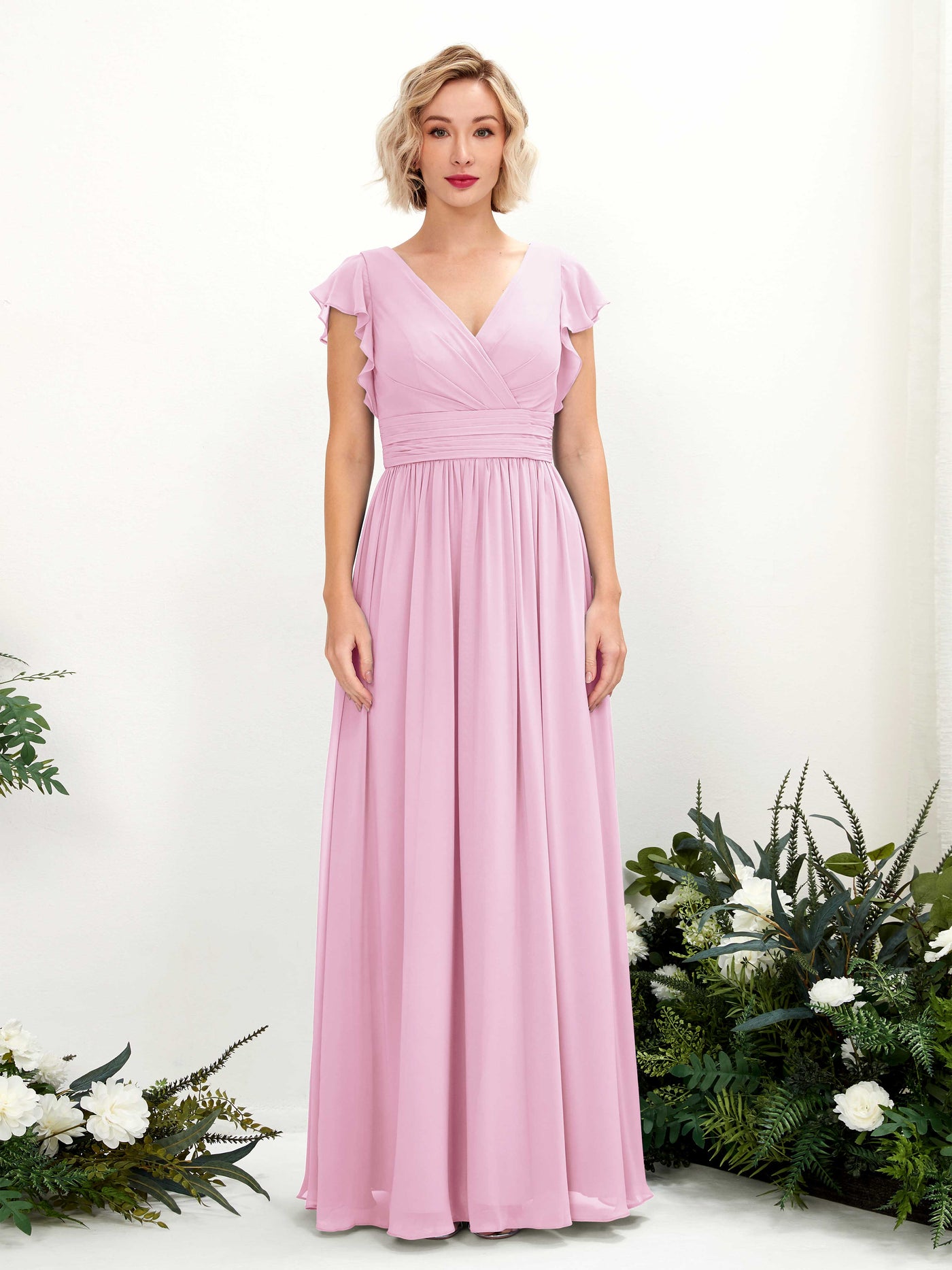 Carlyna Grino A-Line Ballet Pink Bridesmaid Dress Maxi Cap Sleeve V-Neck Dress Front View