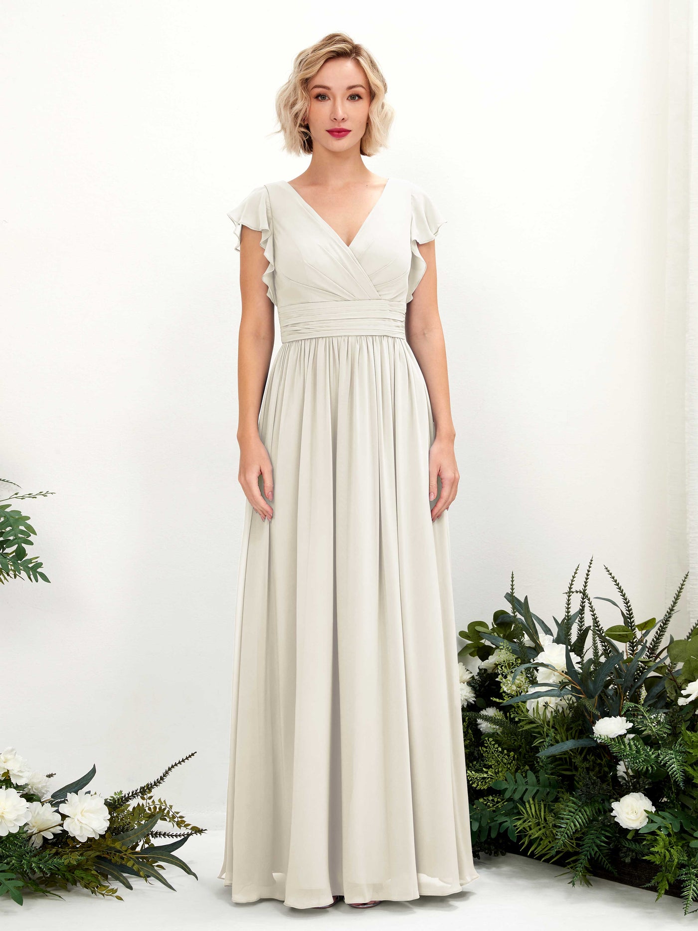 Carlyna Grino A-Line Ivory Bridesmaid Dress Maxi Cap Sleeve V-Neck Dress Front View