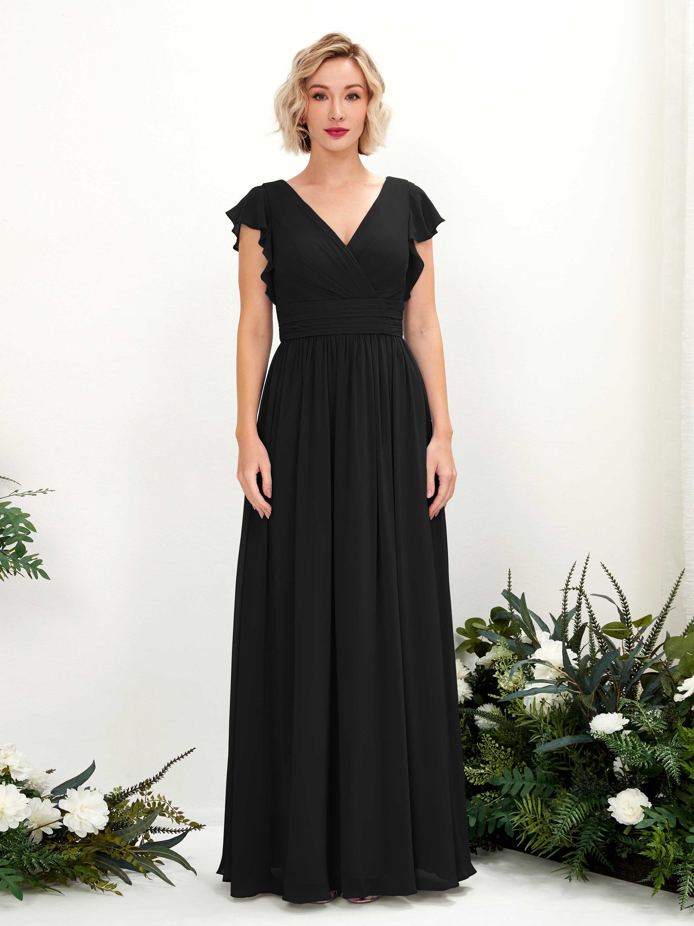 Carlyna Grino A-Line Black Bridesmaid Dress Maxi Cap Sleeve V-Neck Dress Front View