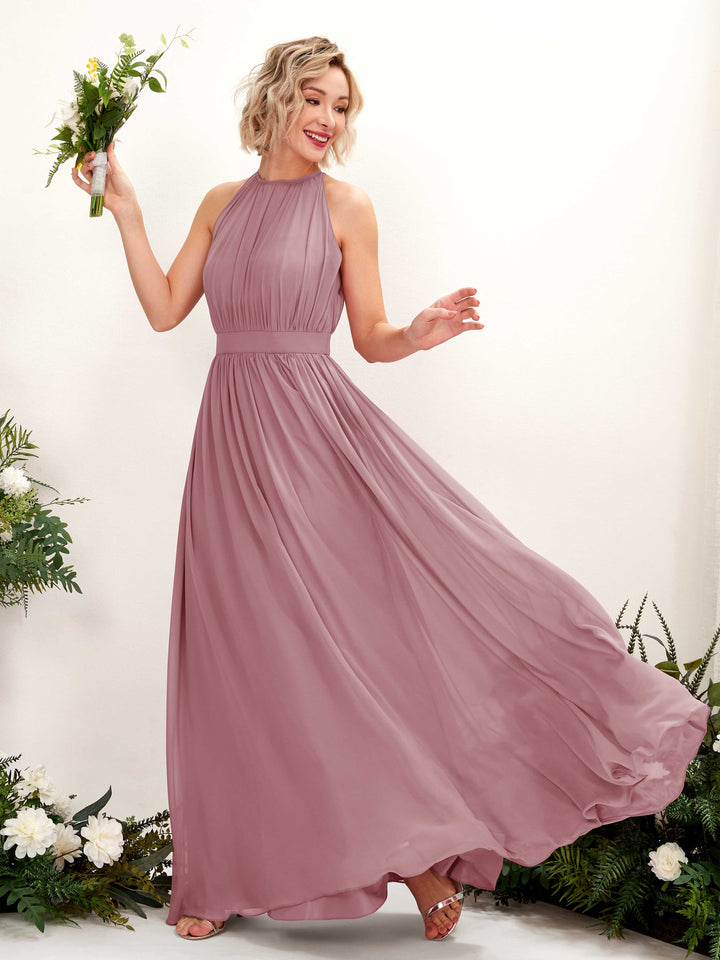 Vintage Mauve Chiffon A-Line Round Neck Maxi Dress