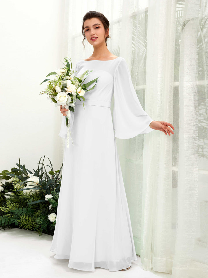 White Chiffon A-Line Boat Neck Long Sleeve Maxi Dress