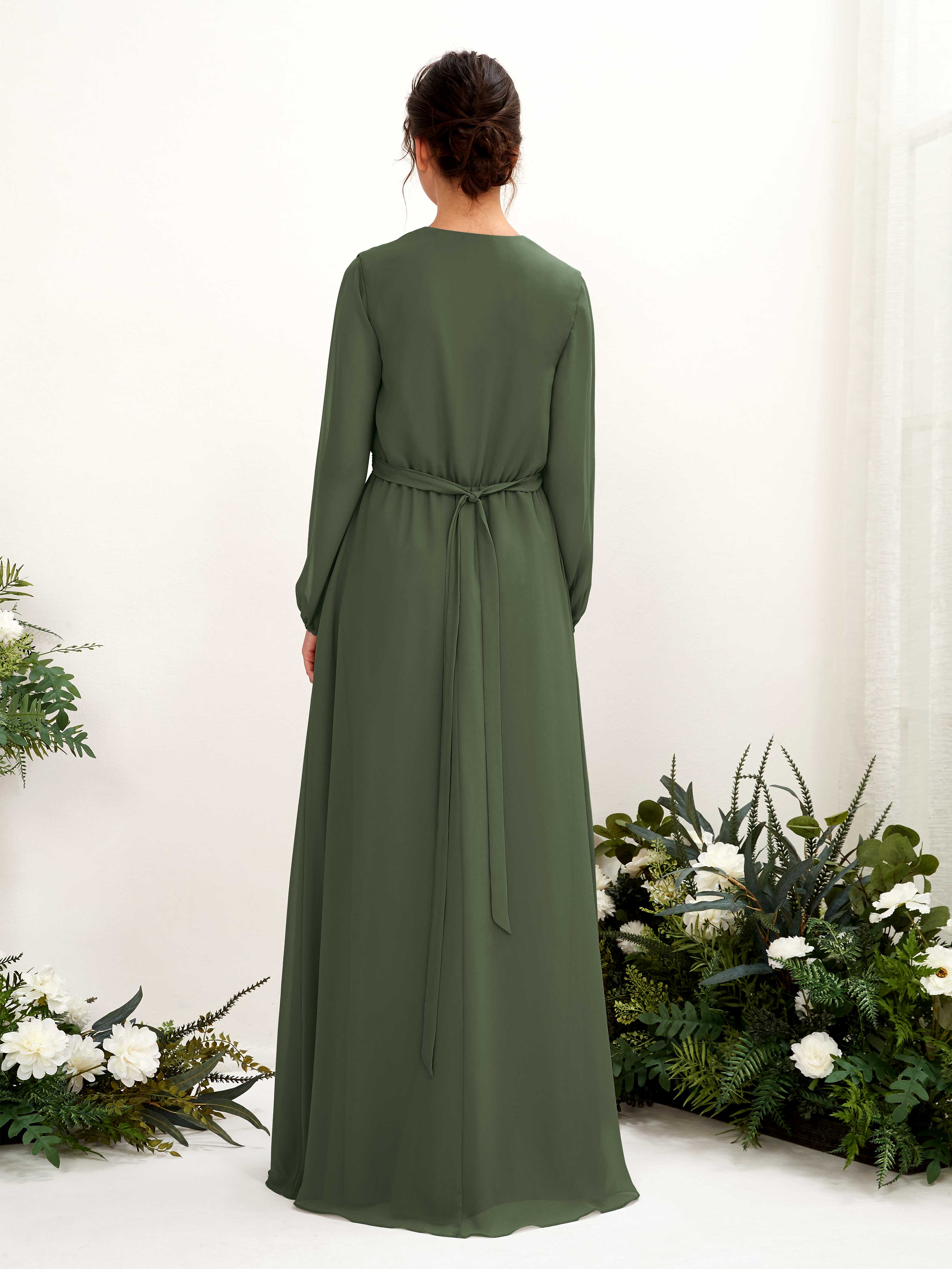Carlyna Elsie A-Line Martini Olive Bridesmaid Dress Maxi Long Sleeve V-Neck Back View