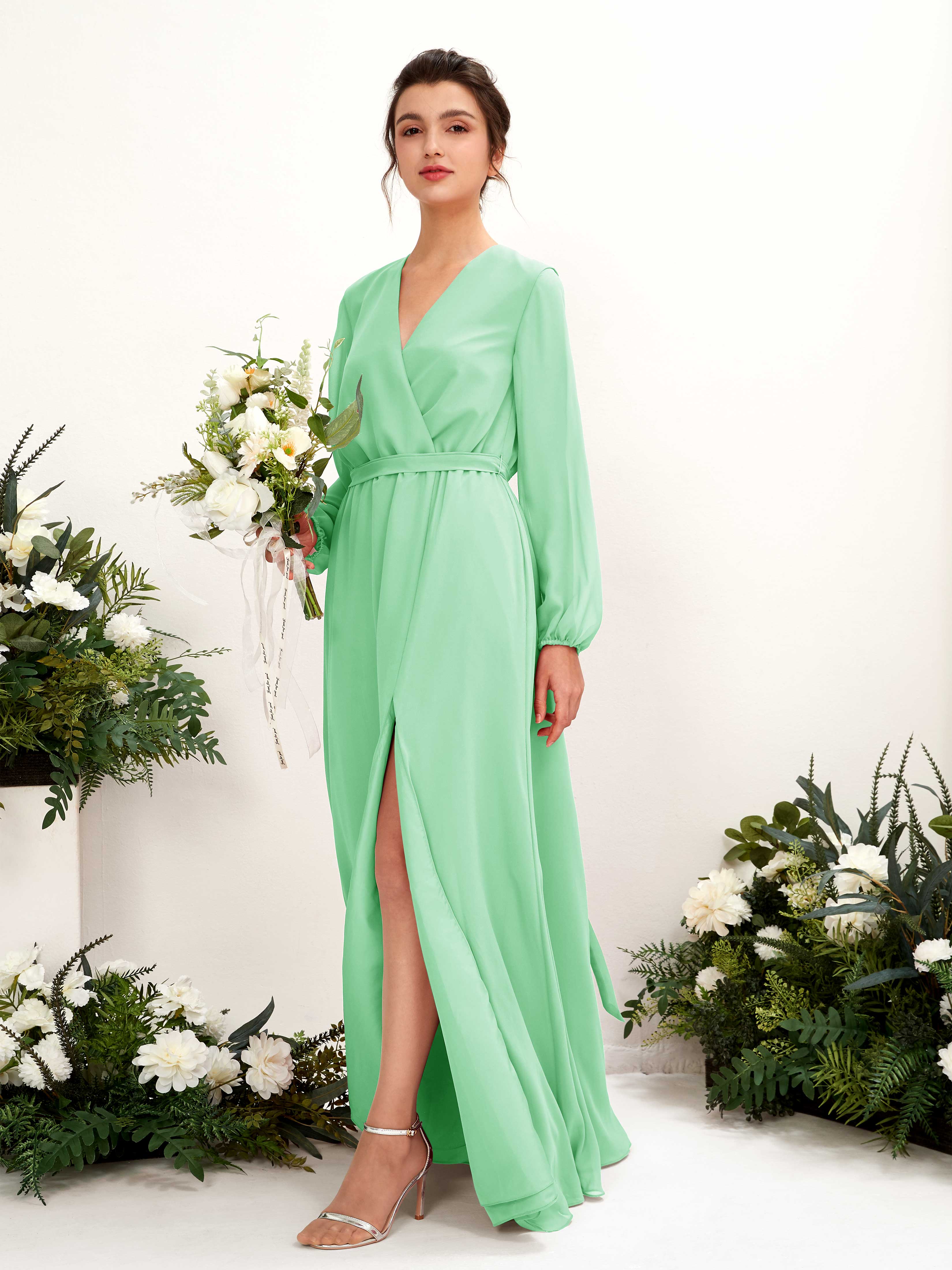 Carlyna Elsie A-Line Mint Green Bridesmaid Dress Maxi Long Sleeve V-Neck Front View