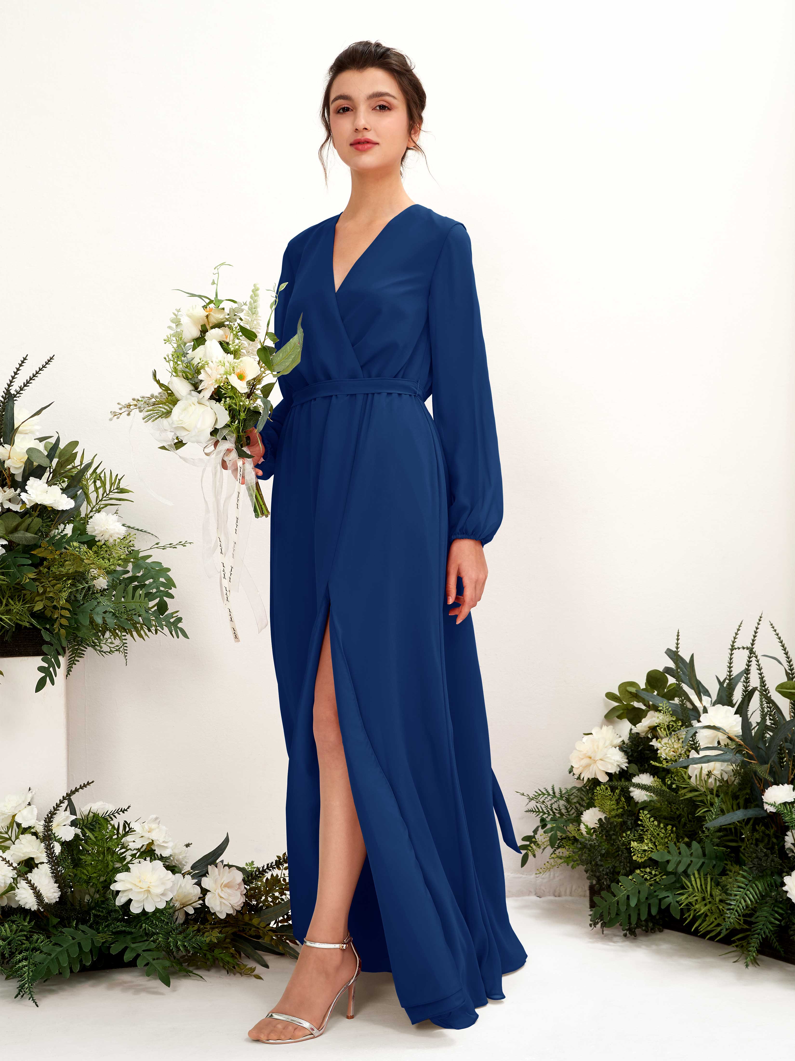 Carlyna Elsie A-Line Royal Blue Bridesmaid Dress Maxi Long Sleeve V-Neck Front View
