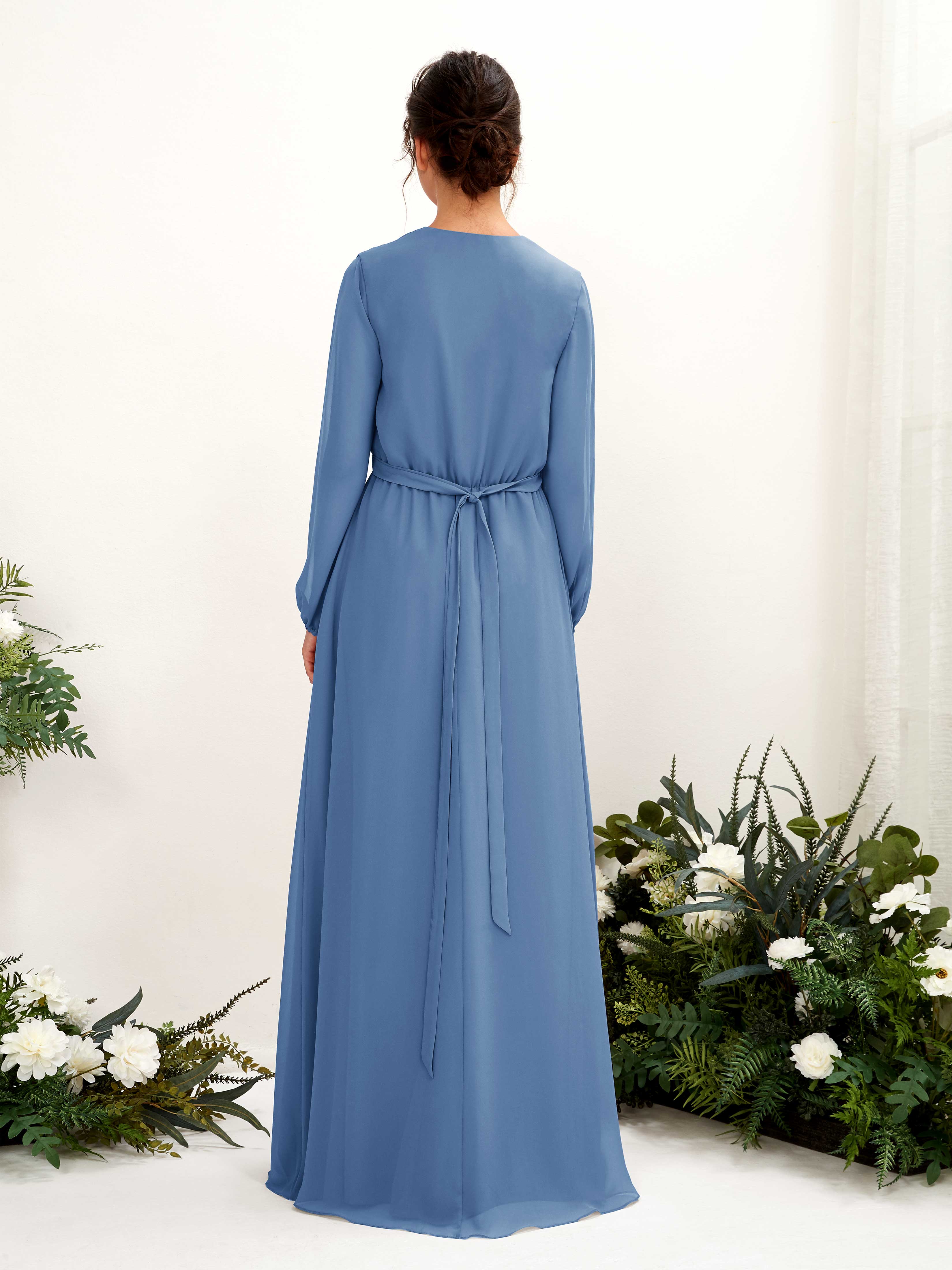 Carlyna Elsie A-Line Dusty Blue Bridesmaid Dress Maxi Long Sleeve V-Neck Back View