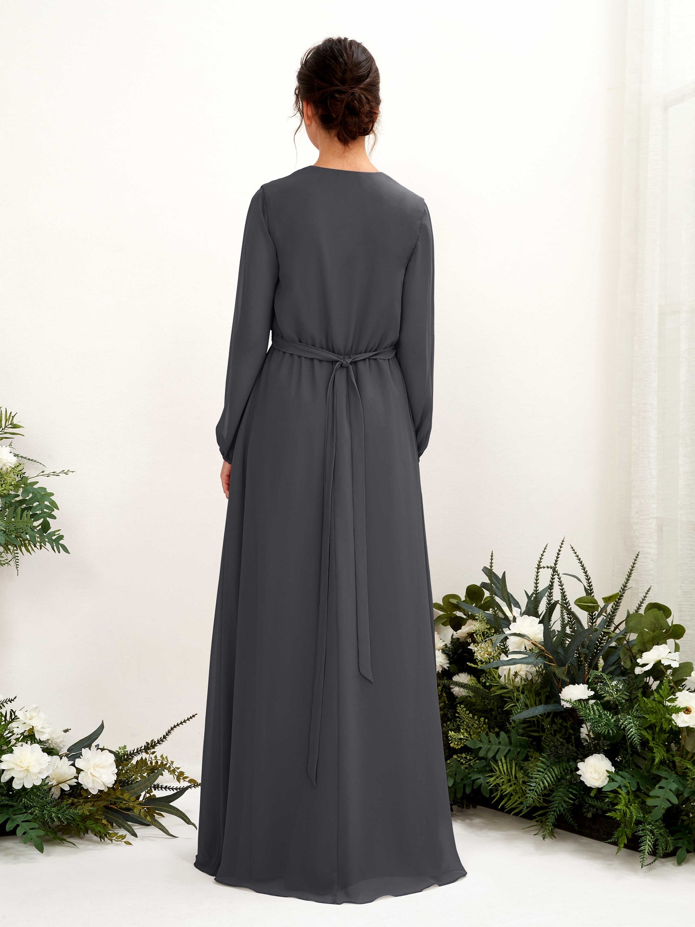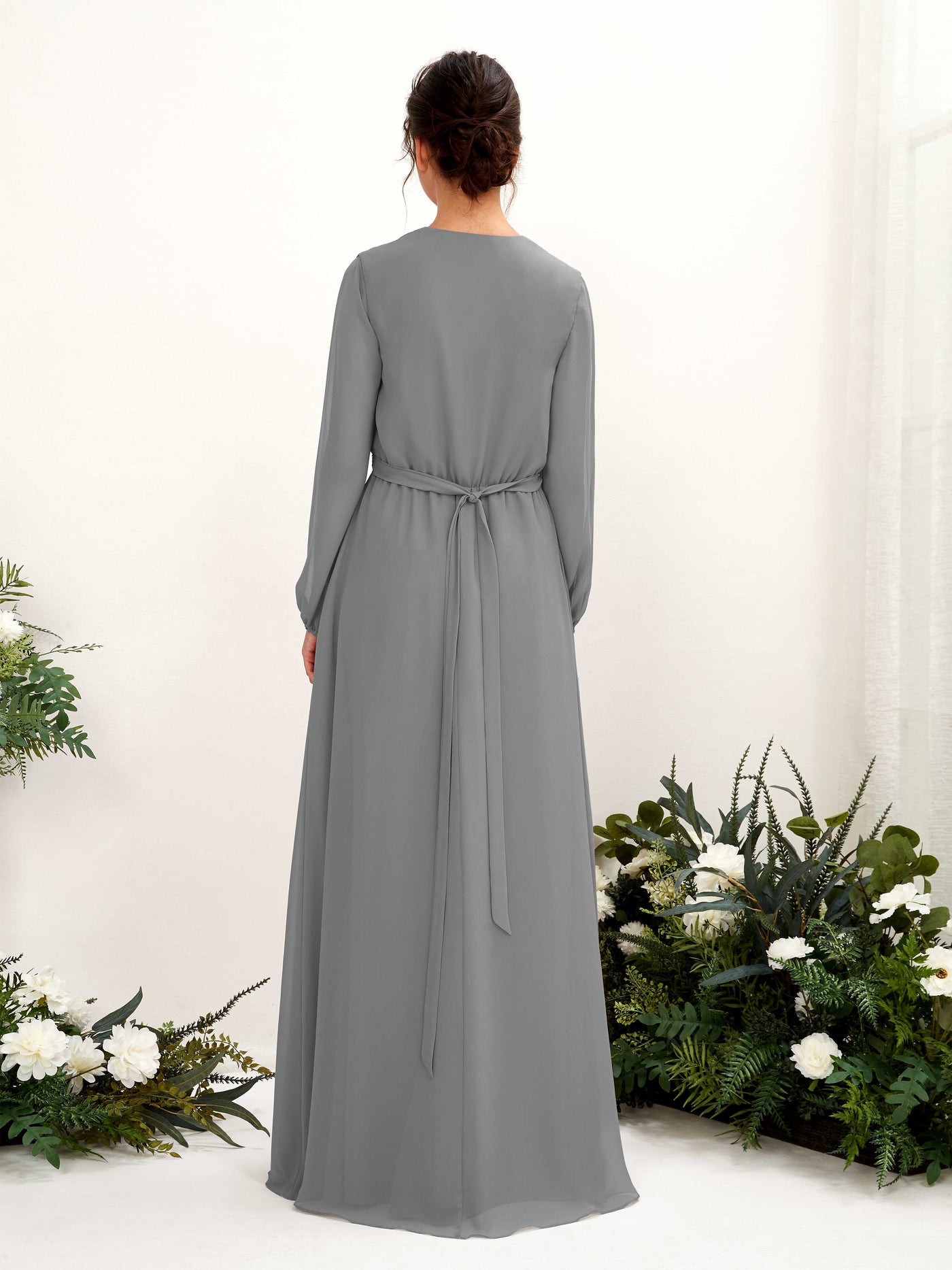 Carlyna Elsie A-Line Steel Gray Bridesmaid Dress Maxi Long Sleeve V-Neck Front View