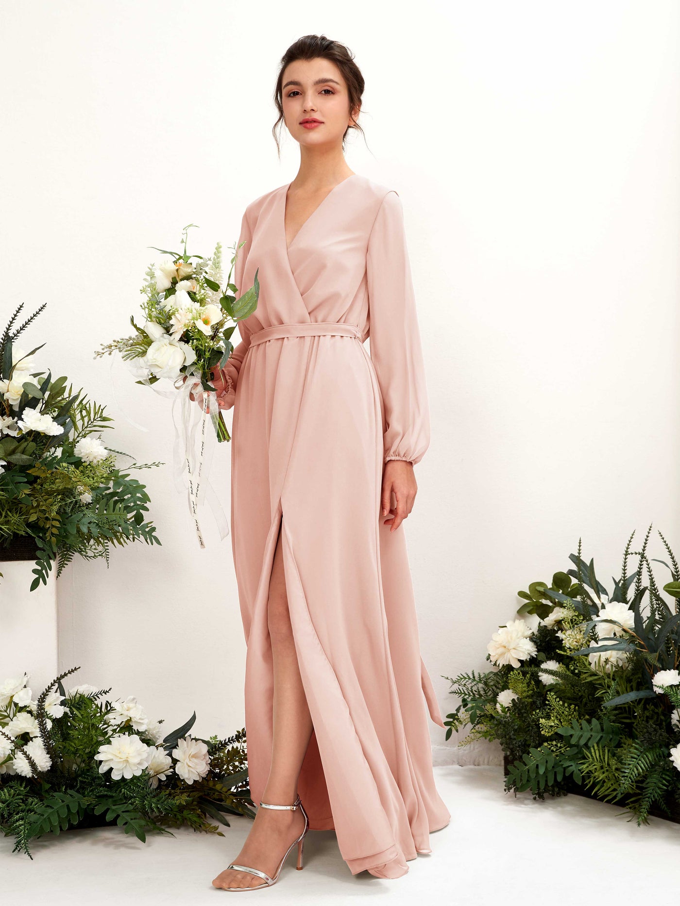 Carlyna Elsie A-Line Champagne Rose Bridesmaid Dress Maxi Long Sleeve V-Neck Front View