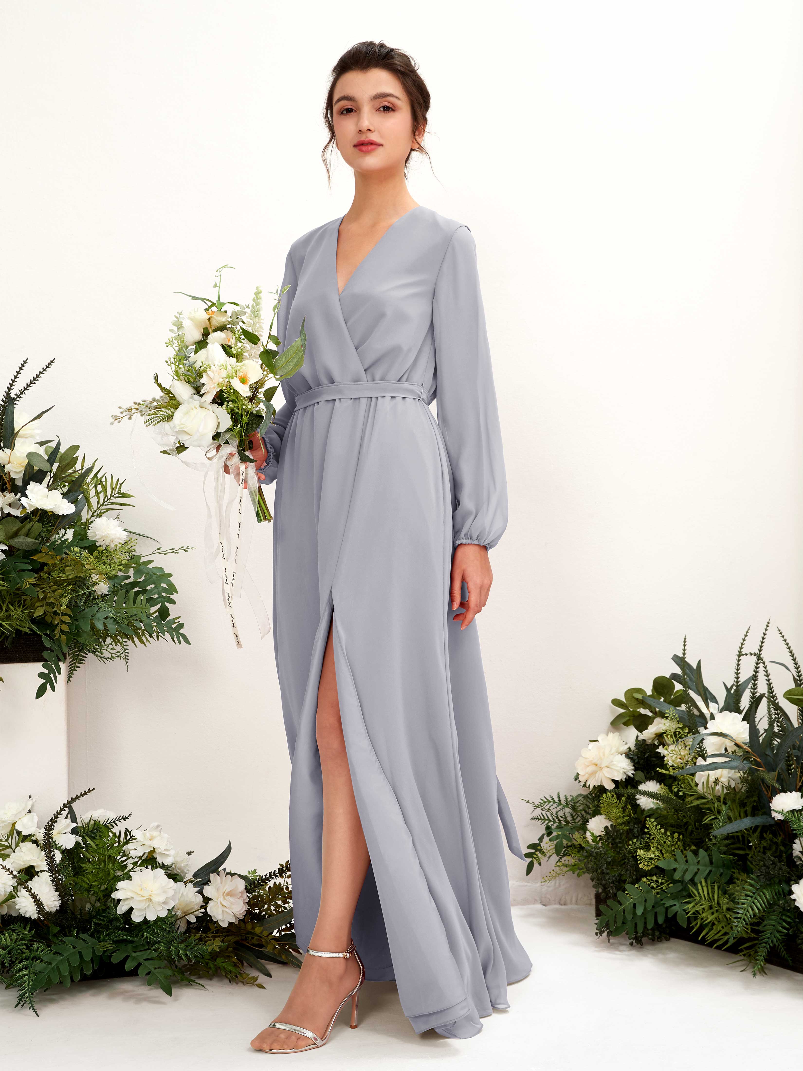 Carlyna Elsie A-Line Silver Bridesmaid Dress Maxi Long Sleeve V-Neck Front View