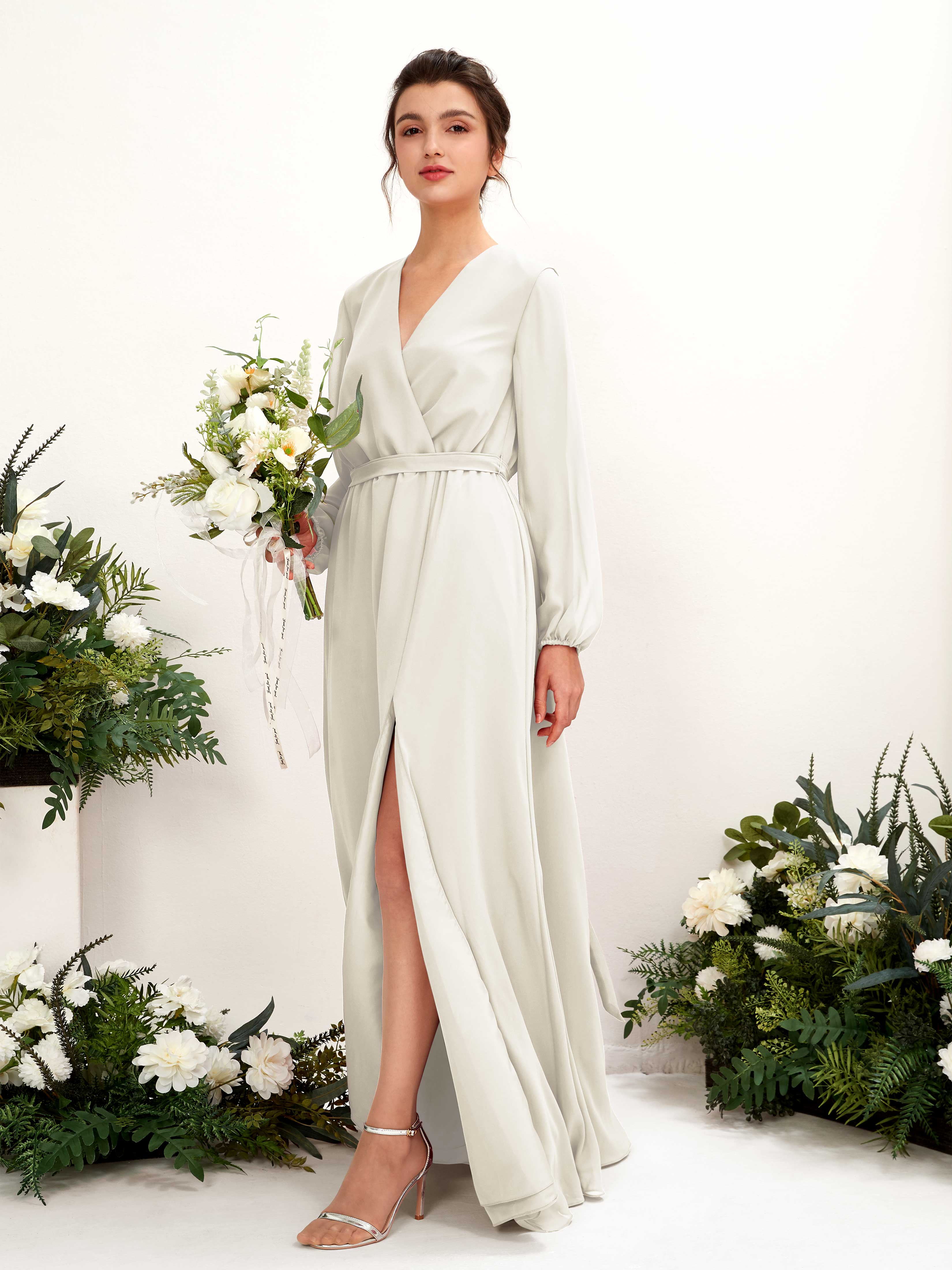 Carlyna Elsie A-Line Ivory Bridesmaid Dress Maxi Long Sleeve V-Neck Front View
