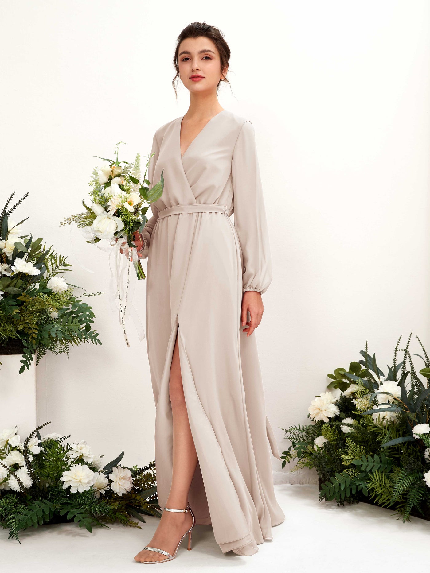 Carlyna Elsie A-Line Biscotti Bridesmaid Dress Maxi Long Sleeve V-Neck Front View