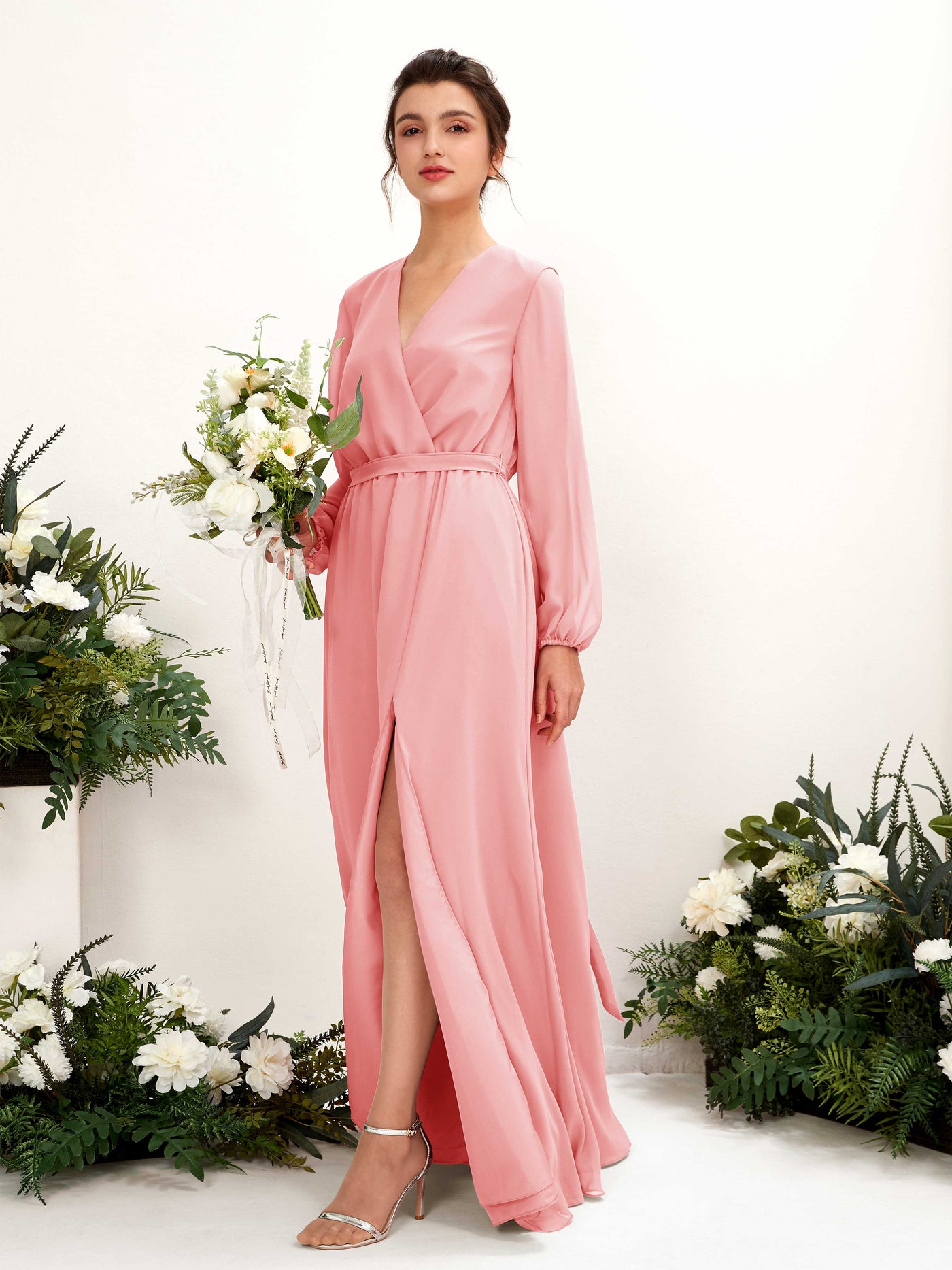 Carlyna Elsie A-Line Coral Pink Bridesmaid Dress Maxi Long Sleeve V-Neck Front View