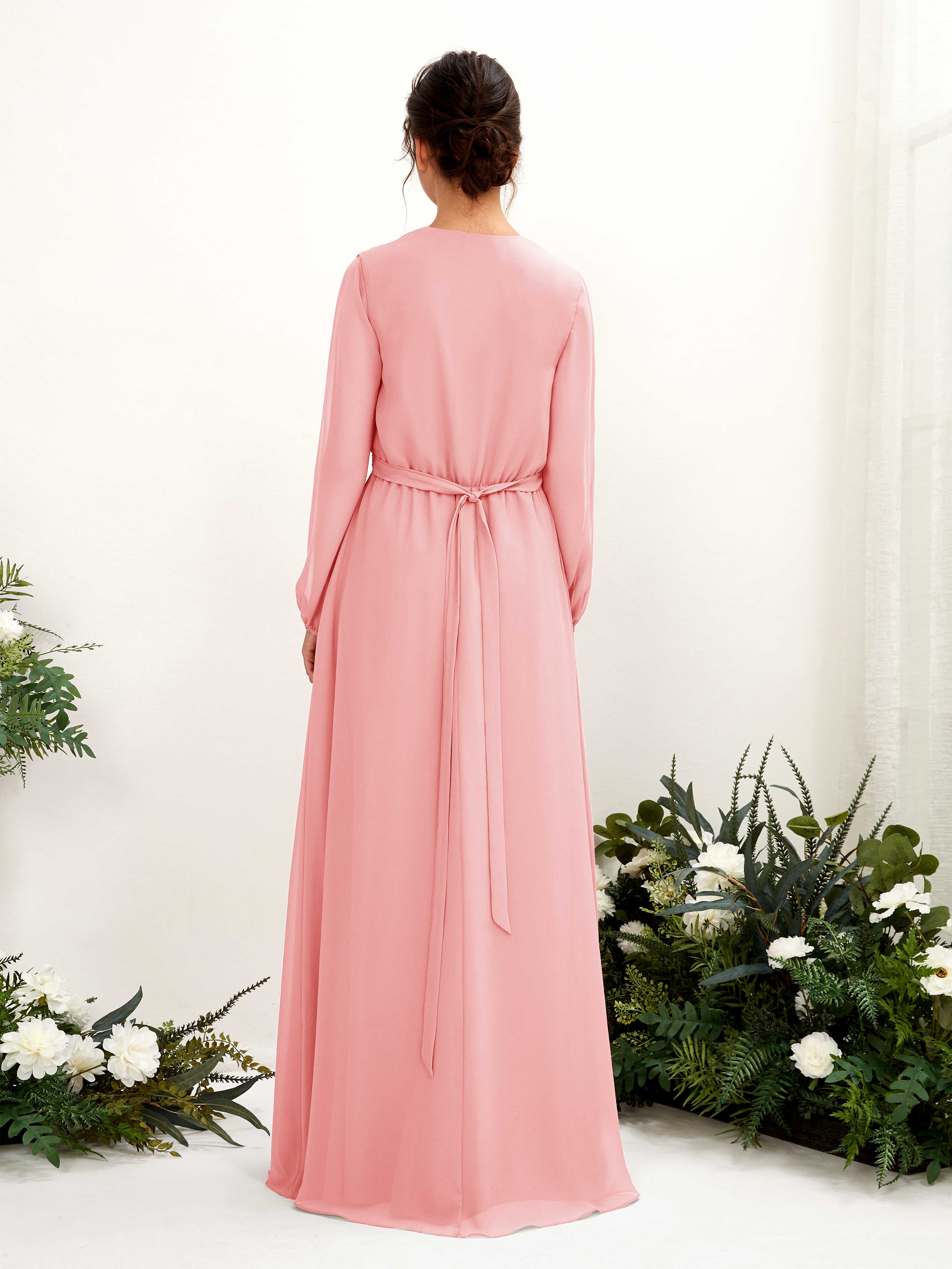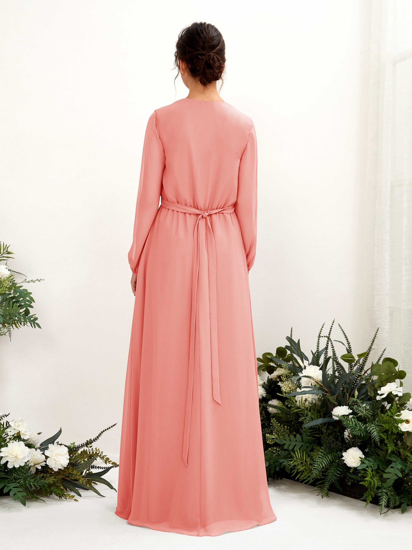 Carlyna Elsie A-Line Coral Pink Bridesmaid Dress Maxi Long Sleeve V-Neck Back View