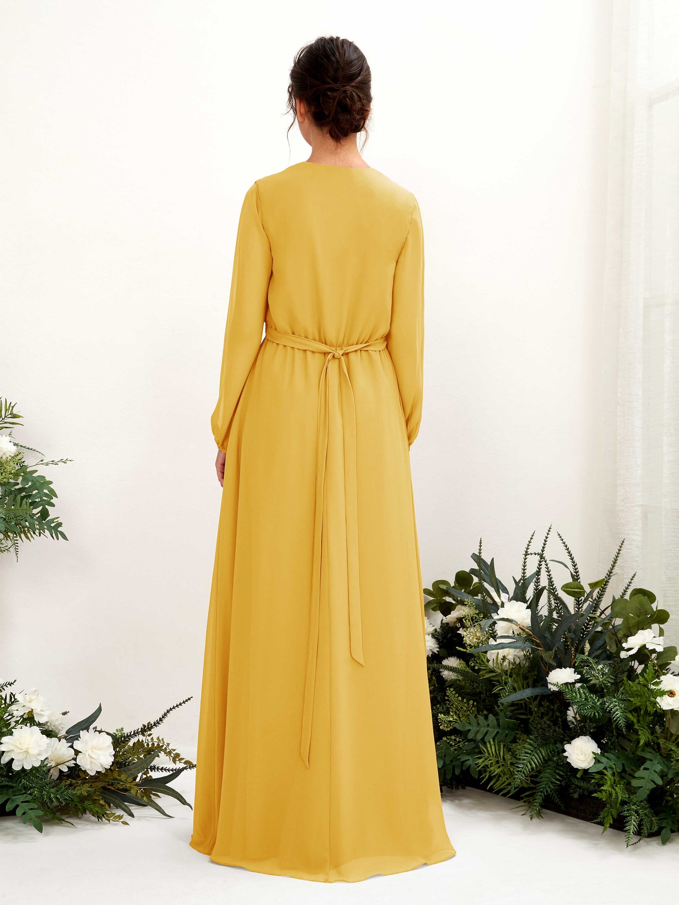 Carlyna Elsie A-Line Mustard Yellow Bridesmaid Dress Maxi Long Sleeve V-Neck Front View