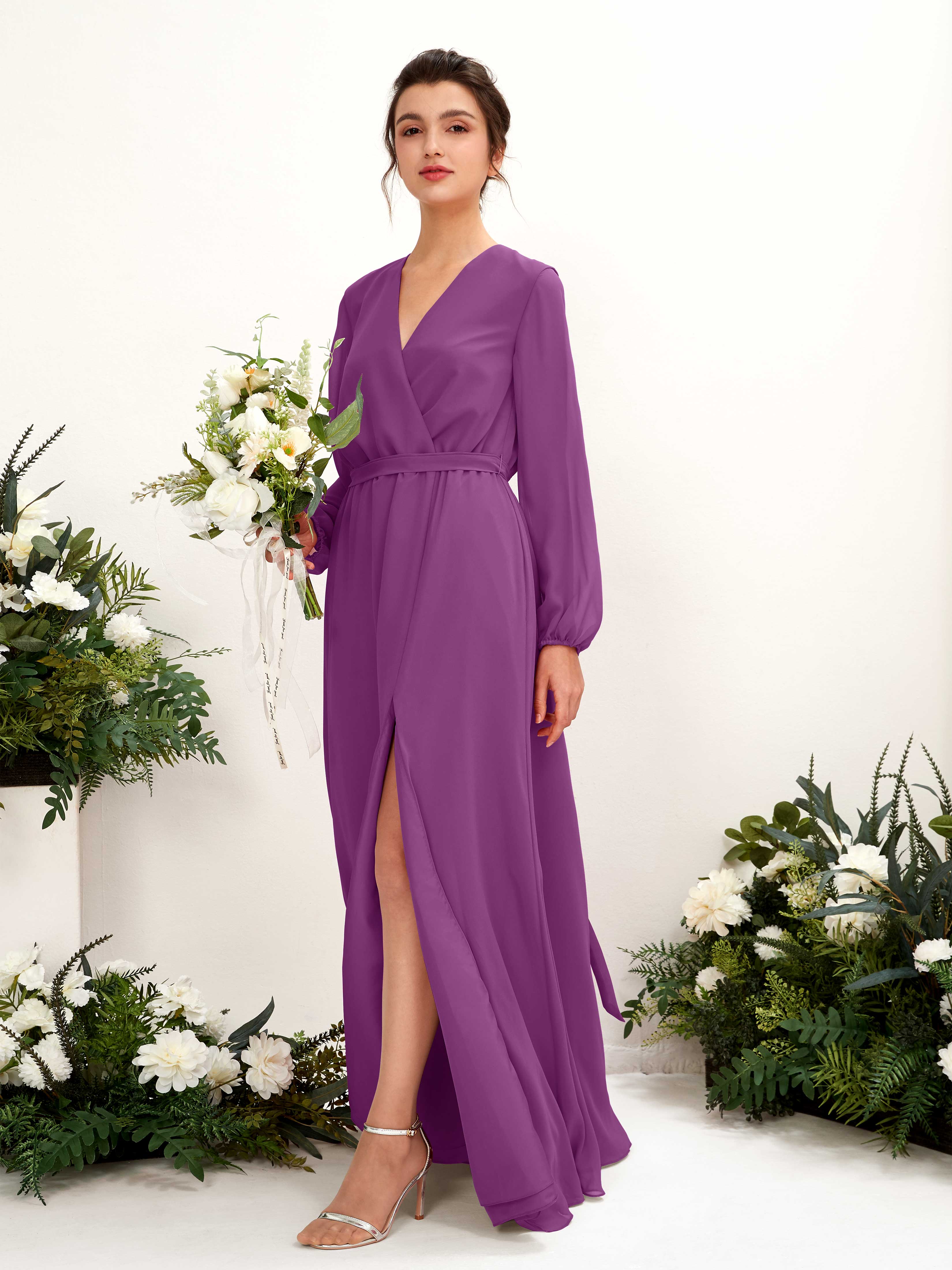 Carlyna Elsie A-Line Purple Bridesmaid Dress Maxi Long Sleeve V-Neck Front View