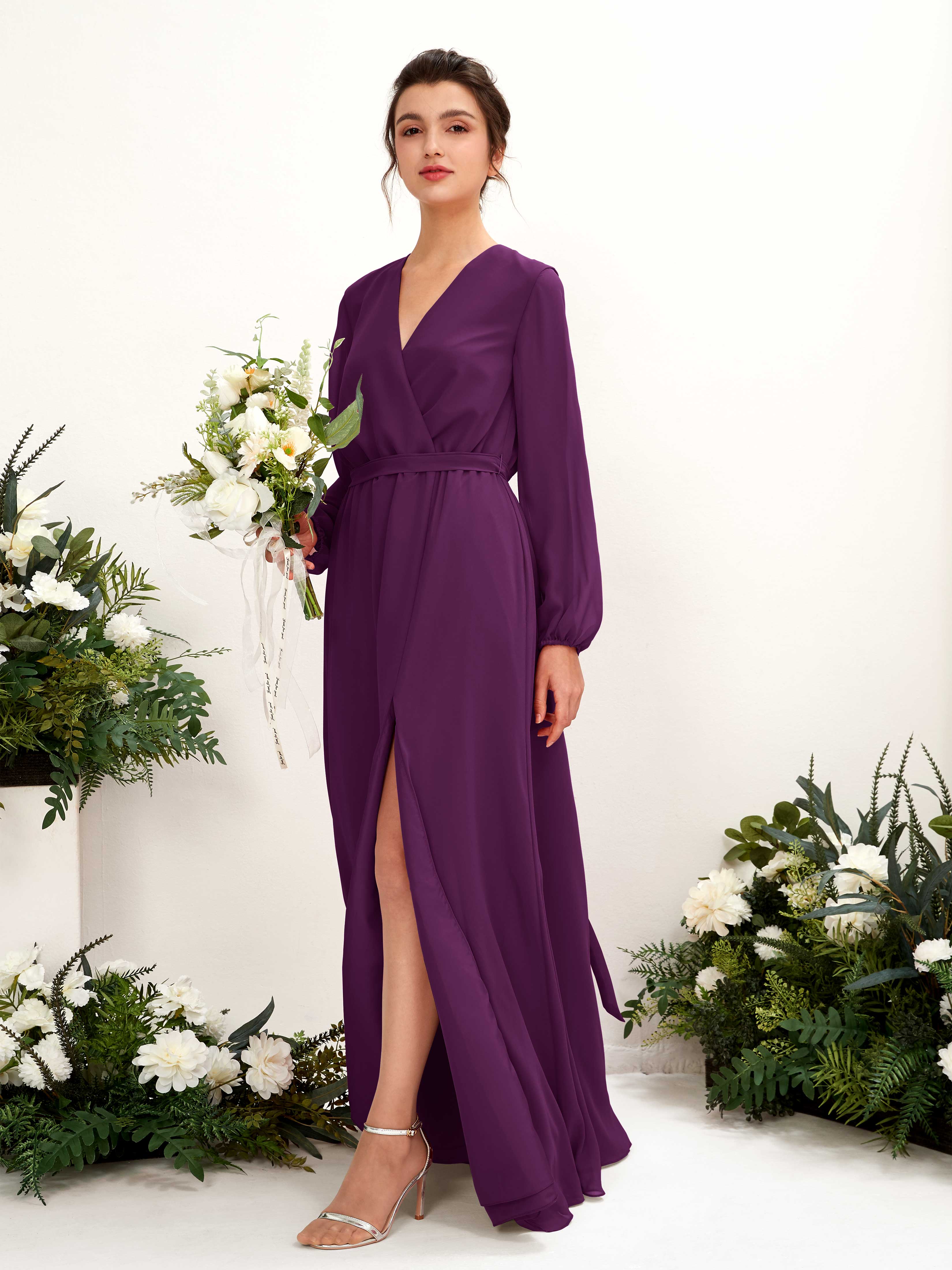 Carlyna Elsie A-Line Grape Bridesmaid Dress Maxi Long Sleeve V-Neck Front View