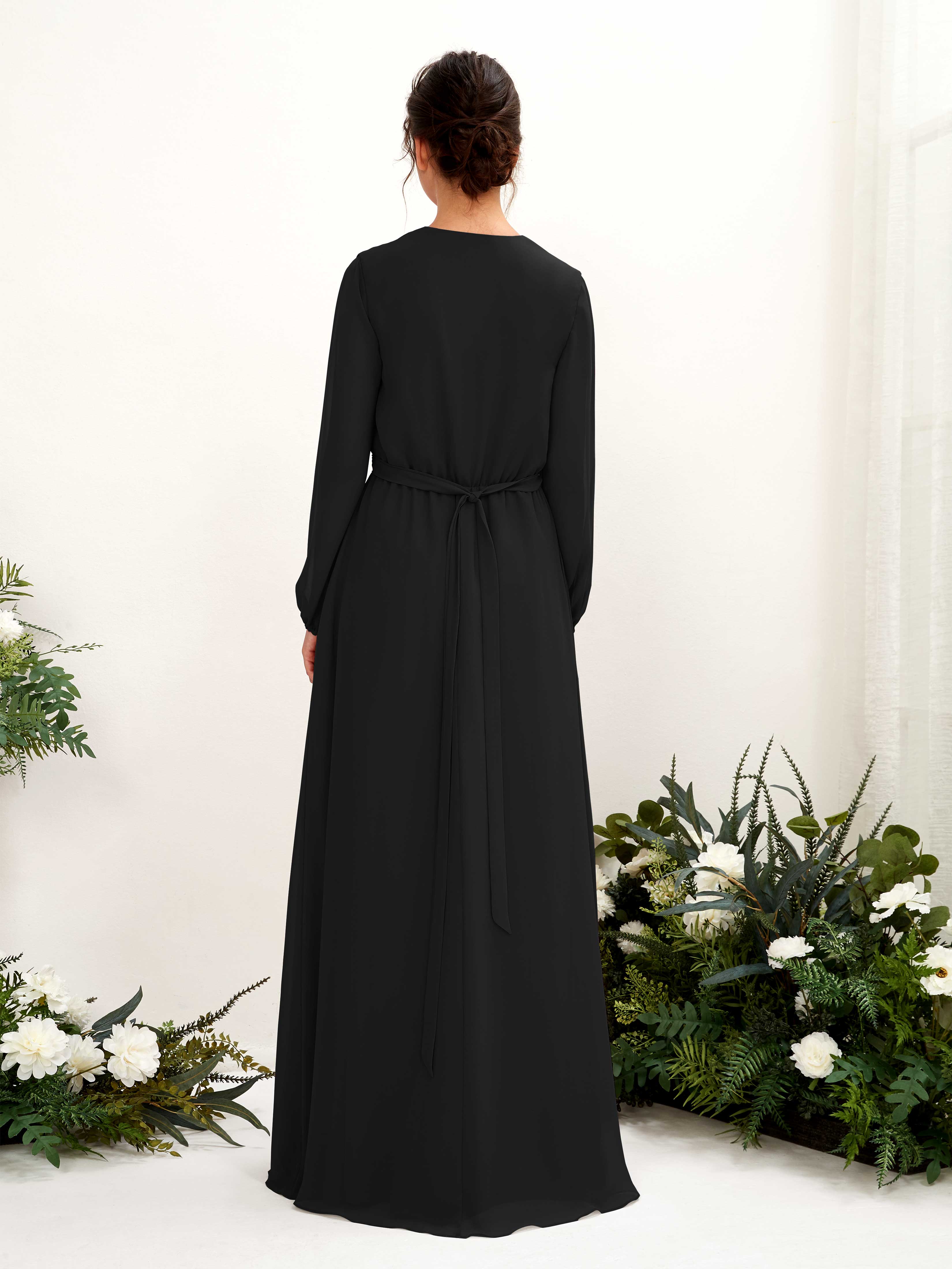 Carlyna Elsie A-Line Black Bridesmaid Dress Maxi Long Sleeve V-Neck Front View