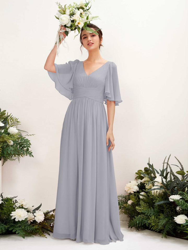 Carlyna Odette A-Line Silver Bridesmaid Dress Maxi Short Sleeve V-Neck Dress Front View