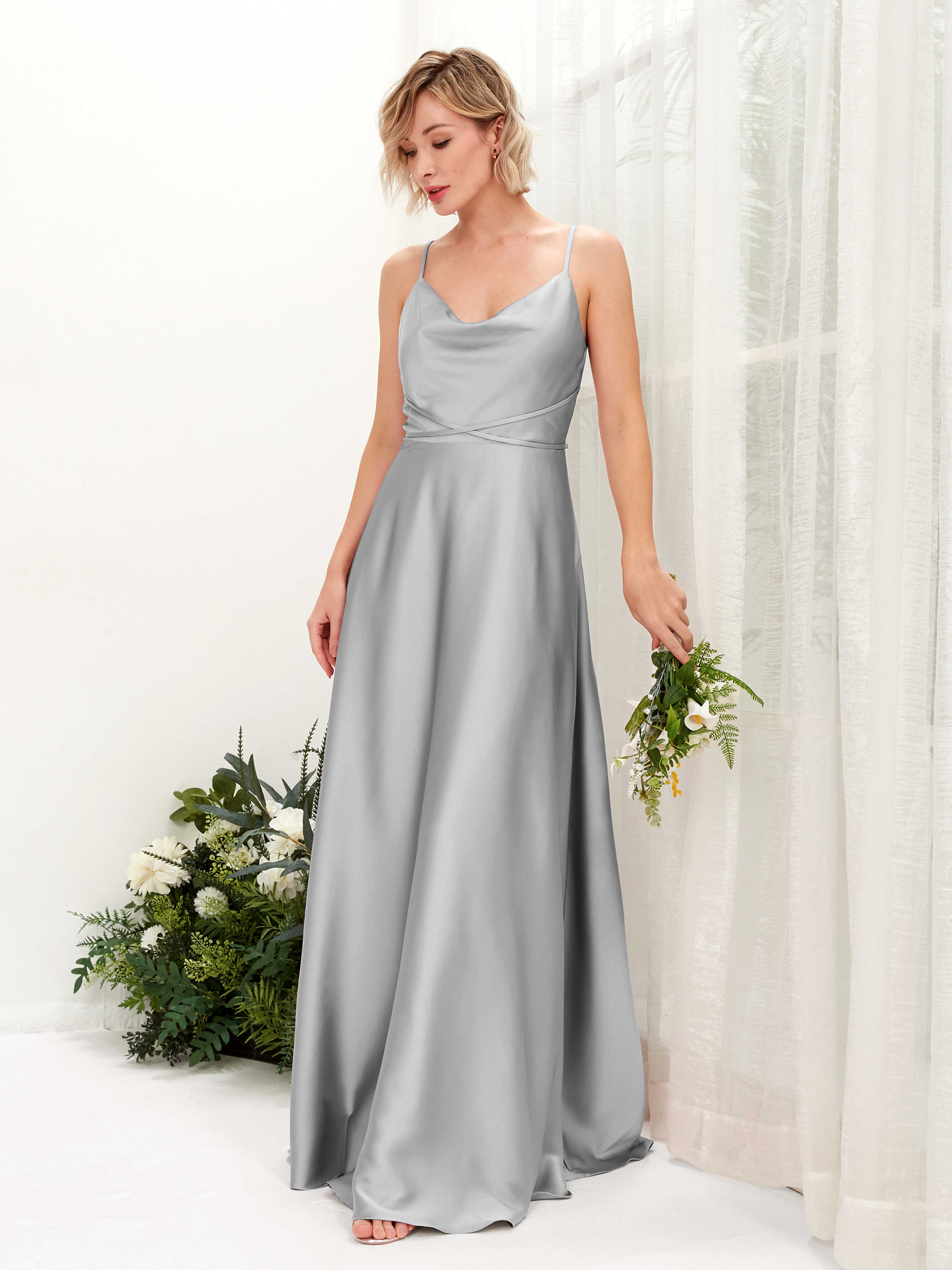 Carlyna Wallis A-Line Steel Gray Satin Bridesmaid Dress Maxi Sleeveless Cowl Neck Dress Front View