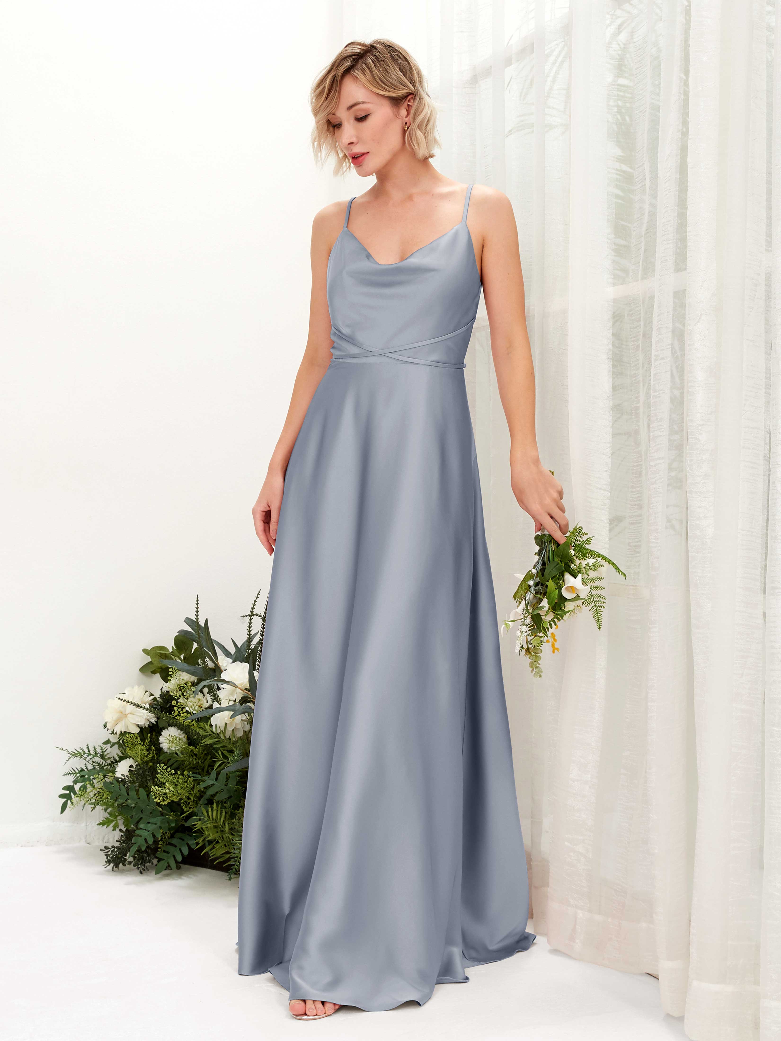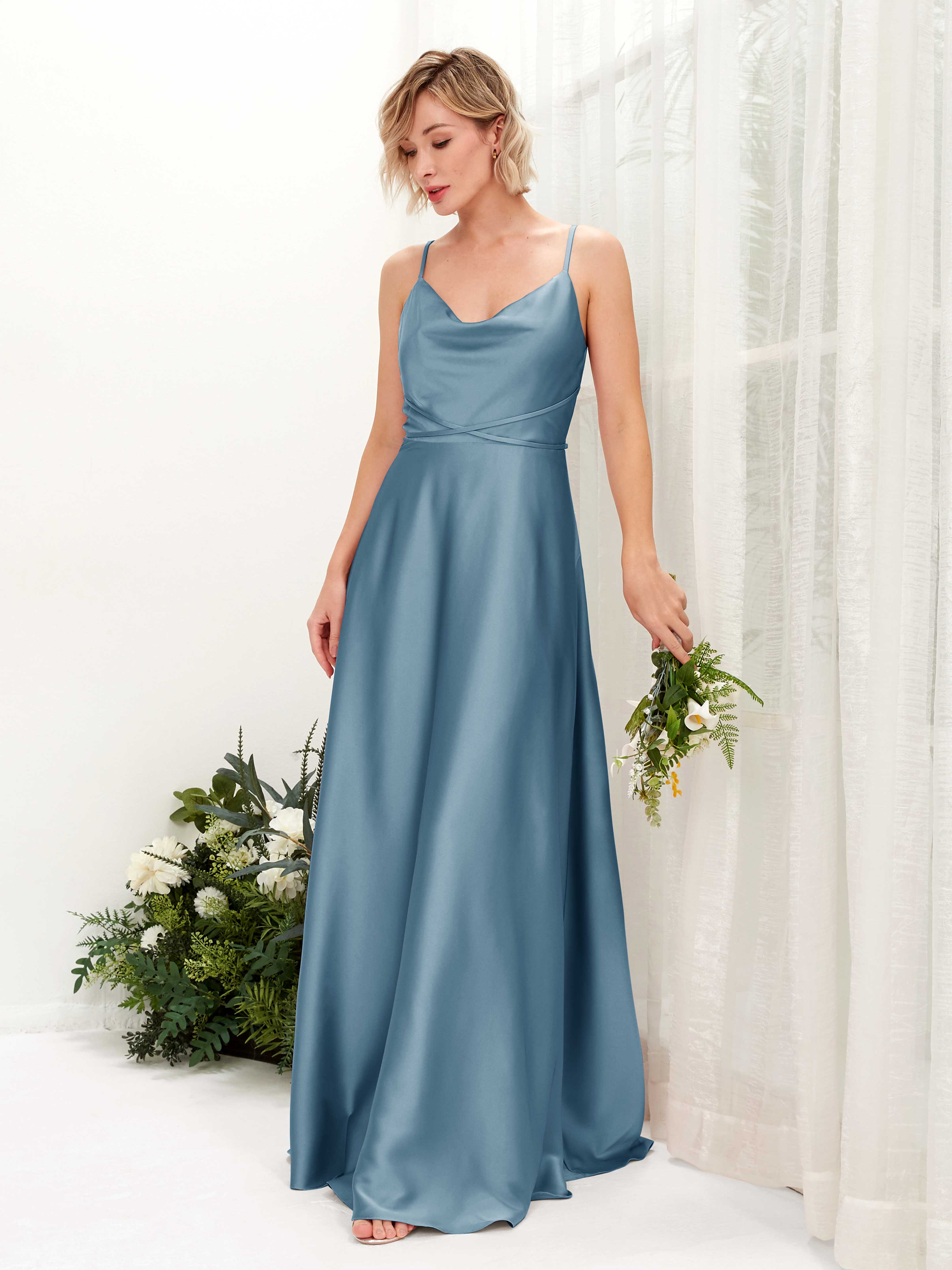 Carlyna Wallis A-Line Dusty Blue Satin Bridesmaid Dress Maxi Sleeveless Cowl Neck Dress Front View