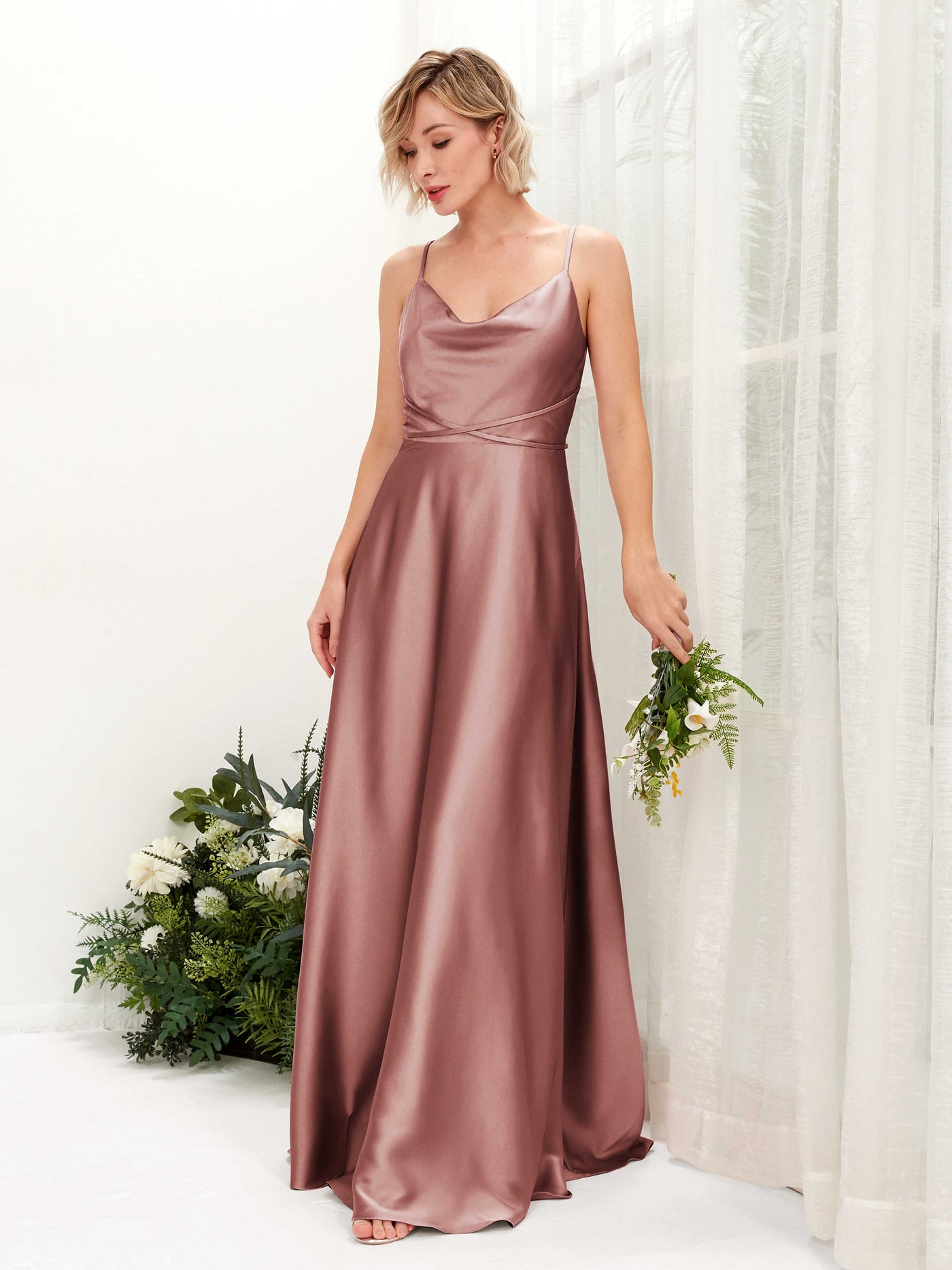 Carlyna Wallis A-Line Dusty Rose Satin Bridesmaid Dress Maxi Sleeveless Cowl Neck Dress Front View